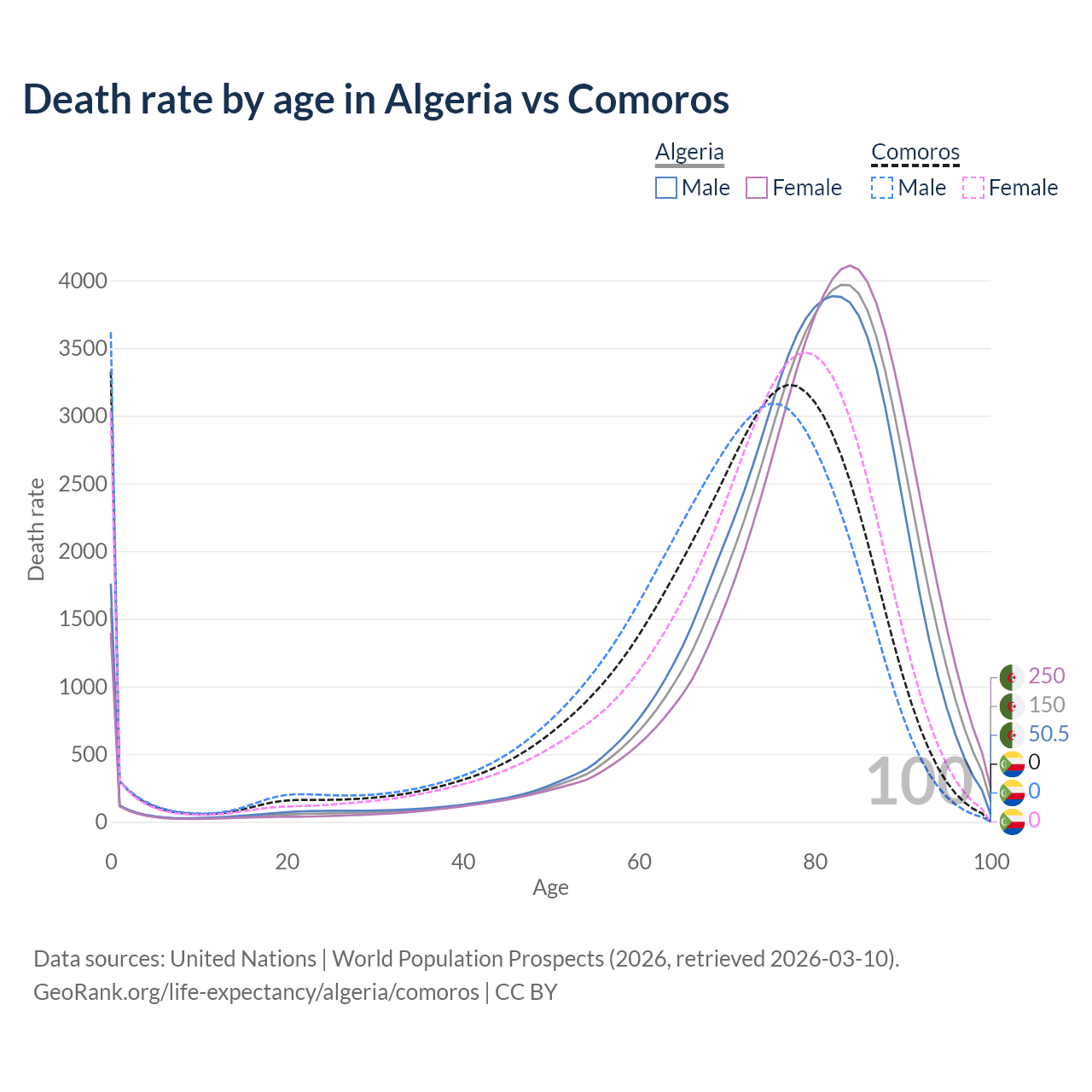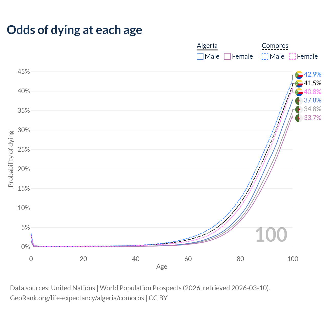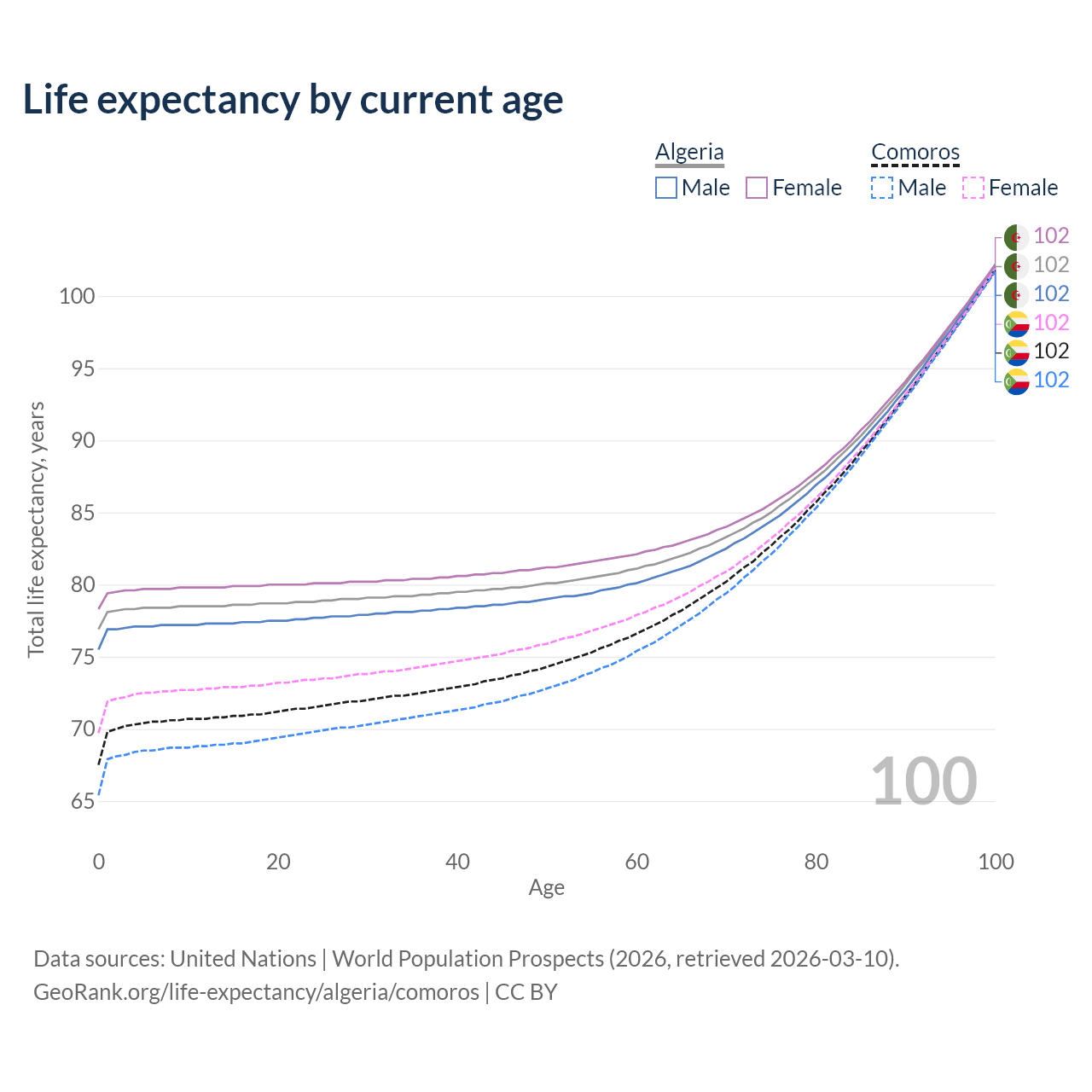 This life expectancy calculator shows the odds of living to 100, 95, 90, and below based on current age for both males and females in Algeria and Comoros, along with mean and median age of death. The calculations are based on the 2026 life tables (actuarial tables) from the UN World Population Prospects.
