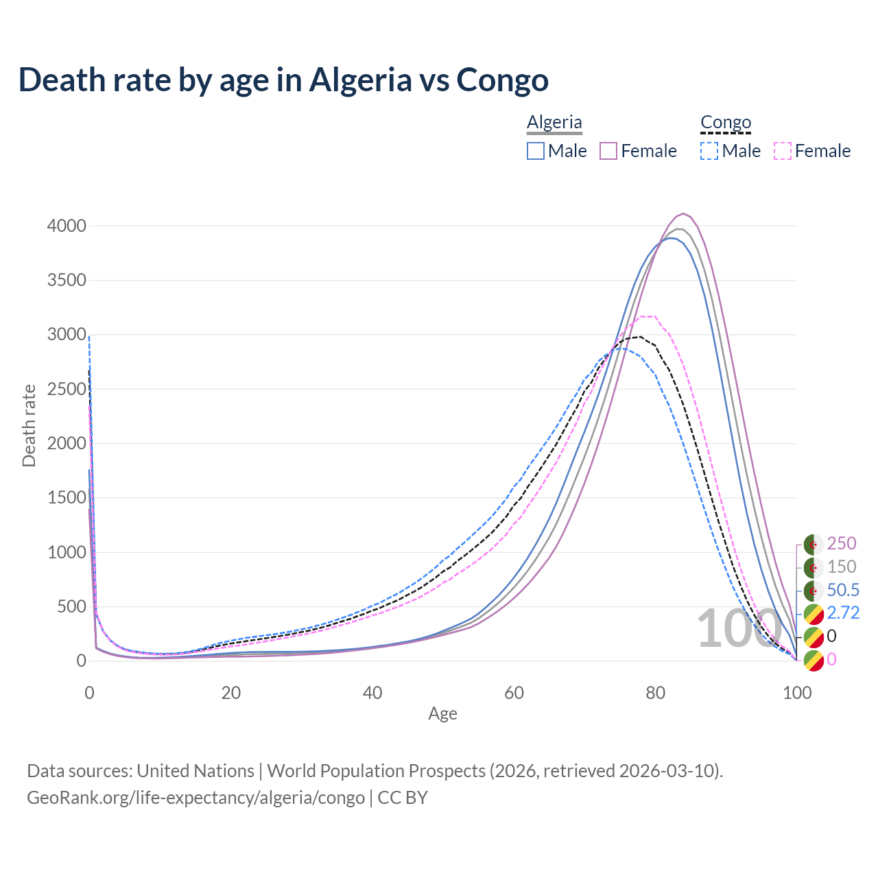 This life expectancy calculator shows the odds of living to 100, 95, 90, and below based on current age for both males and females in Algeria and the Congo, along with mean and median age of death. The calculations are based on the 2026 life tables (actuarial tables) from the UN World Population Prospects.