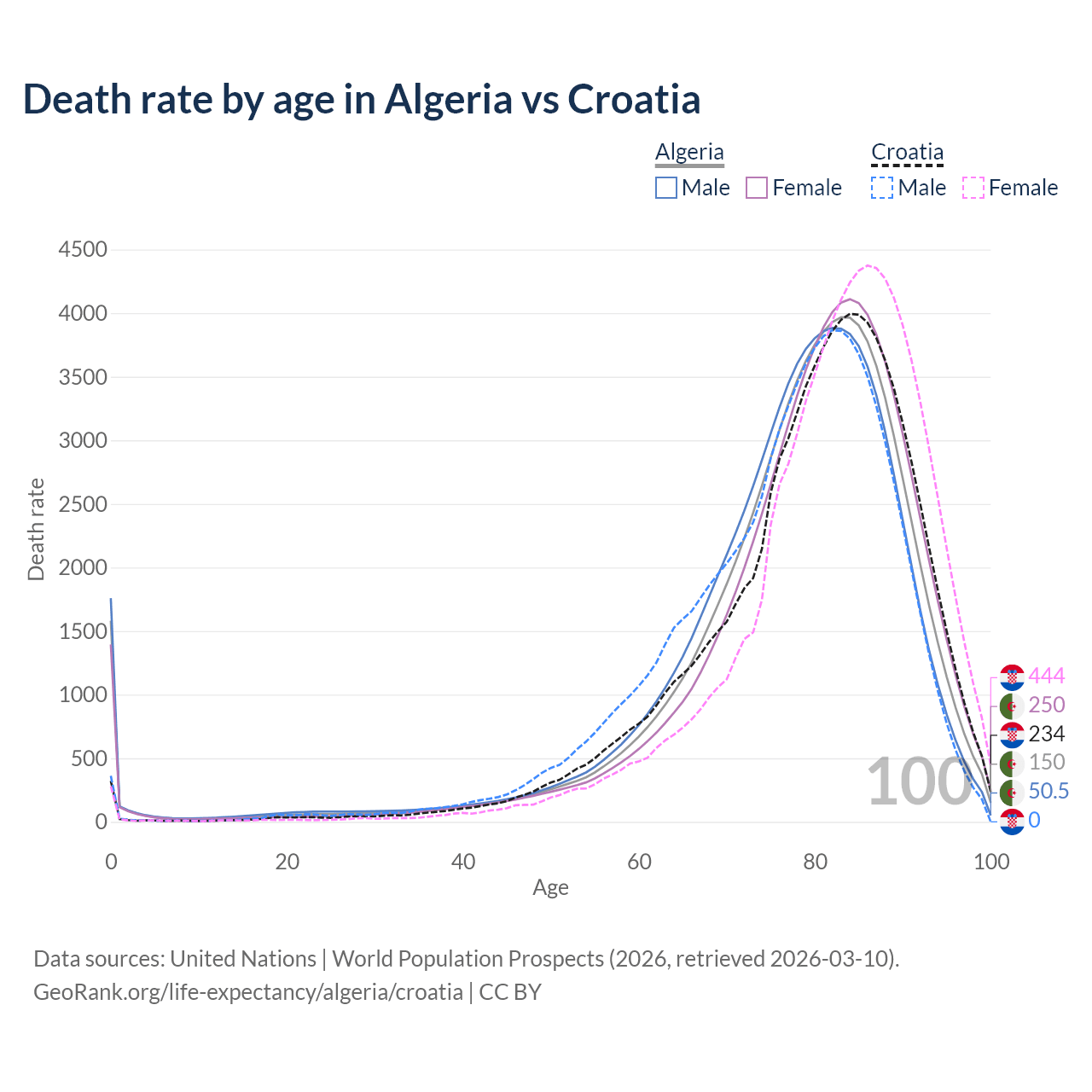 This life expectancy calculator shows the odds of living to 100, 95, 90, and below based on current age for both males and females in Algeria and Croatia, along with mean and median age of death. The calculations are based on the 2026 life tables (actuarial tables) from the UN World Population Prospects.