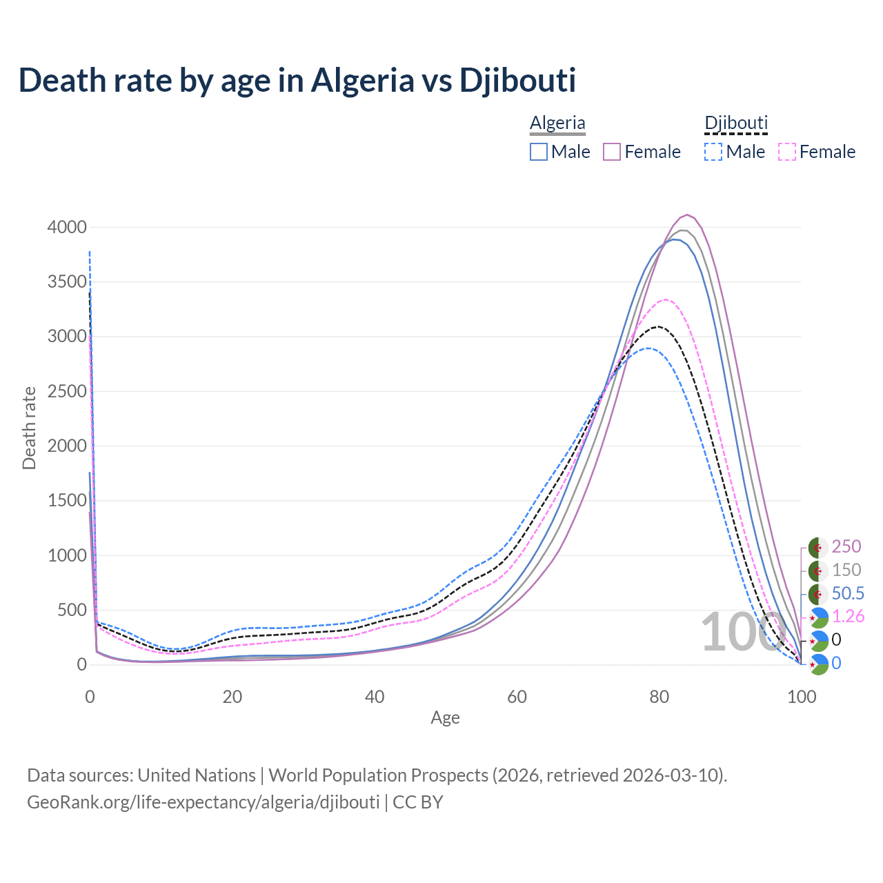 In Algeria, the most common age of death is 83, compared to 0 in Djibouti. The median age of death is 80.4 in Algeria and 73.7 in Djibouti, meaning only half of each cohort is expected to live past that age.