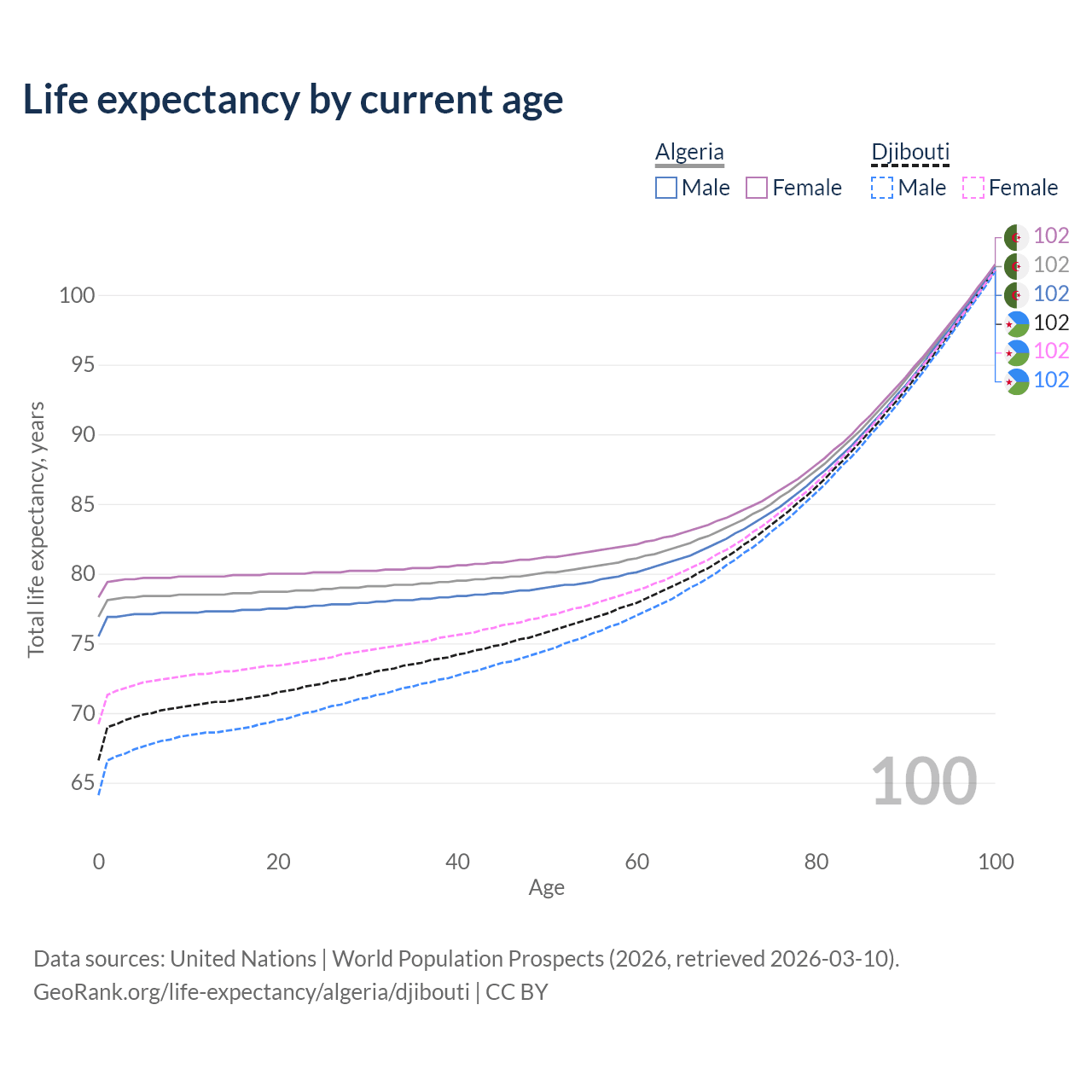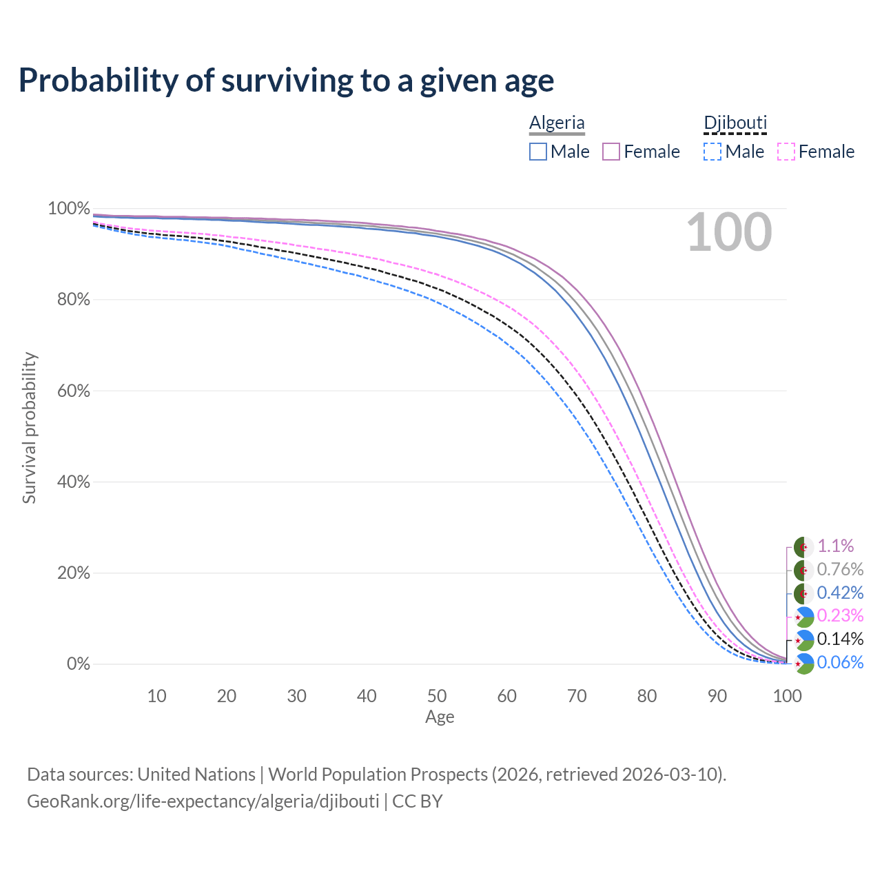 This life expectancy calculator shows the odds of living to 100, 95, 90, and below based on current age for both males and females in Algeria and Djibouti, along with mean and median age of death. The calculations are based on the 2026 life tables (actuarial tables) from the UN World Population Prospects.