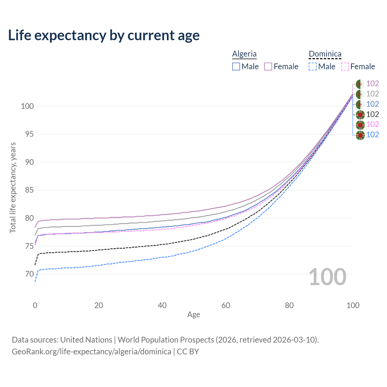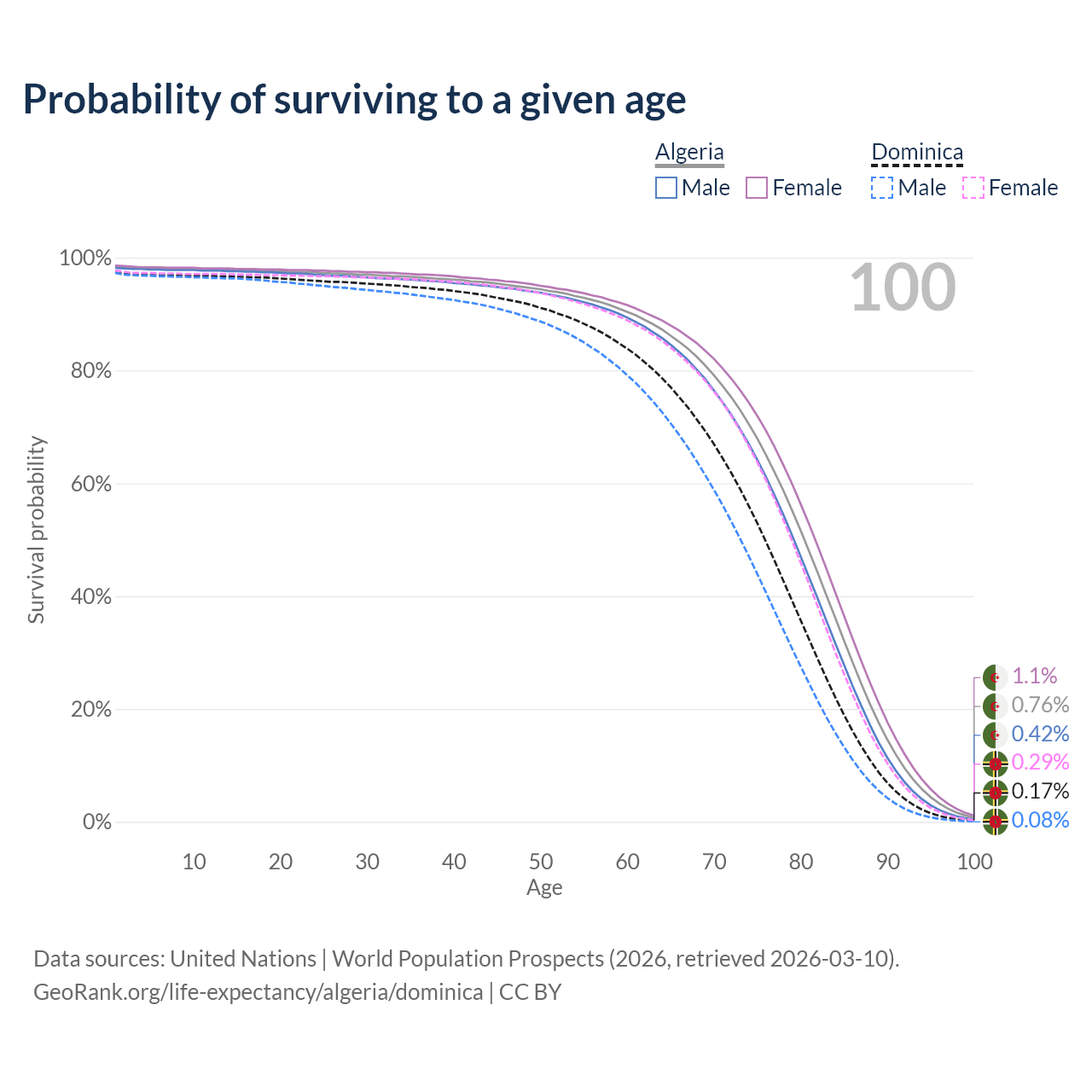 This life expectancy calculator shows the odds of living to 100, 95, 90, and below based on current age for both males and females in Algeria and Dominica, along with mean and median age of death. The calculations are based on the 2026 life tables (actuarial tables) from the UN World Population Prospects.