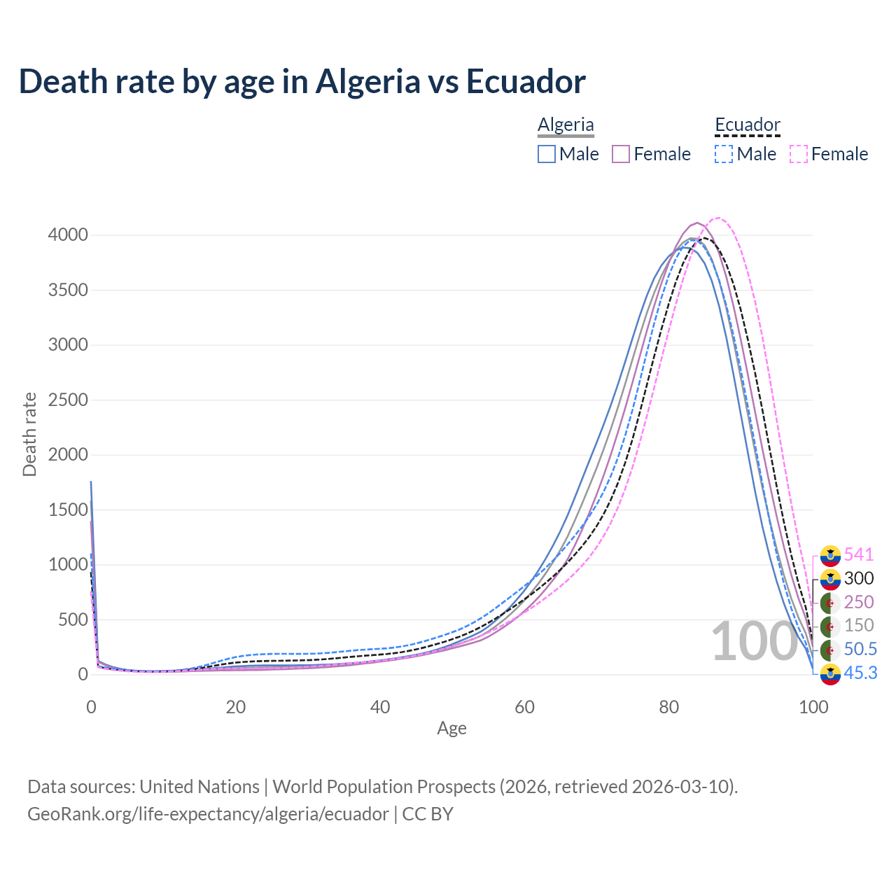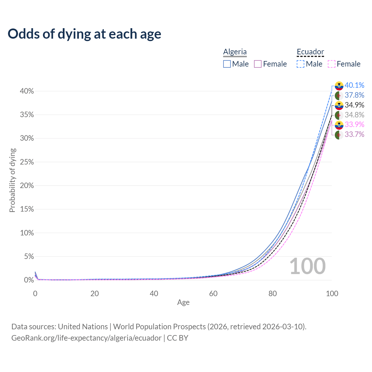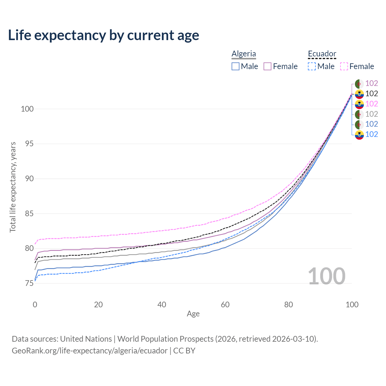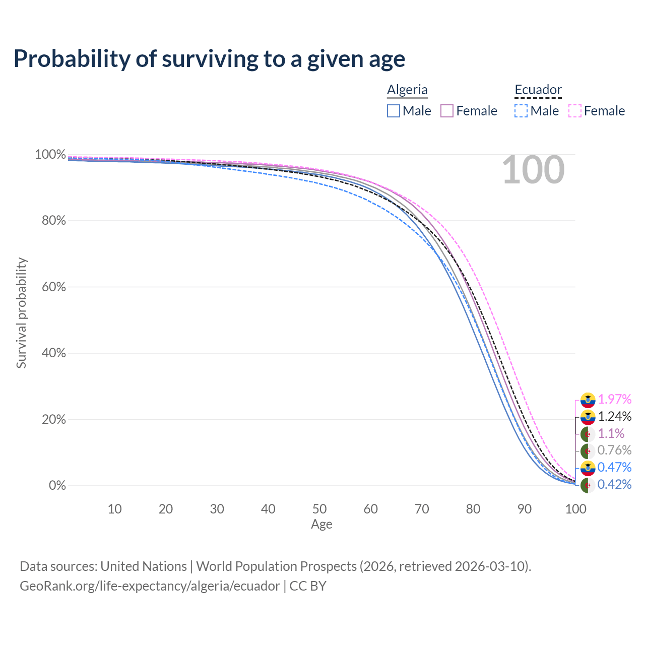 This life expectancy calculator shows the odds of living to 100, 95, 90, and below based on current age for both males and females in Algeria and Ecuador, along with mean and median age of death. The calculations are based on the 2026 life tables (actuarial tables) from the UN World Population Prospects.