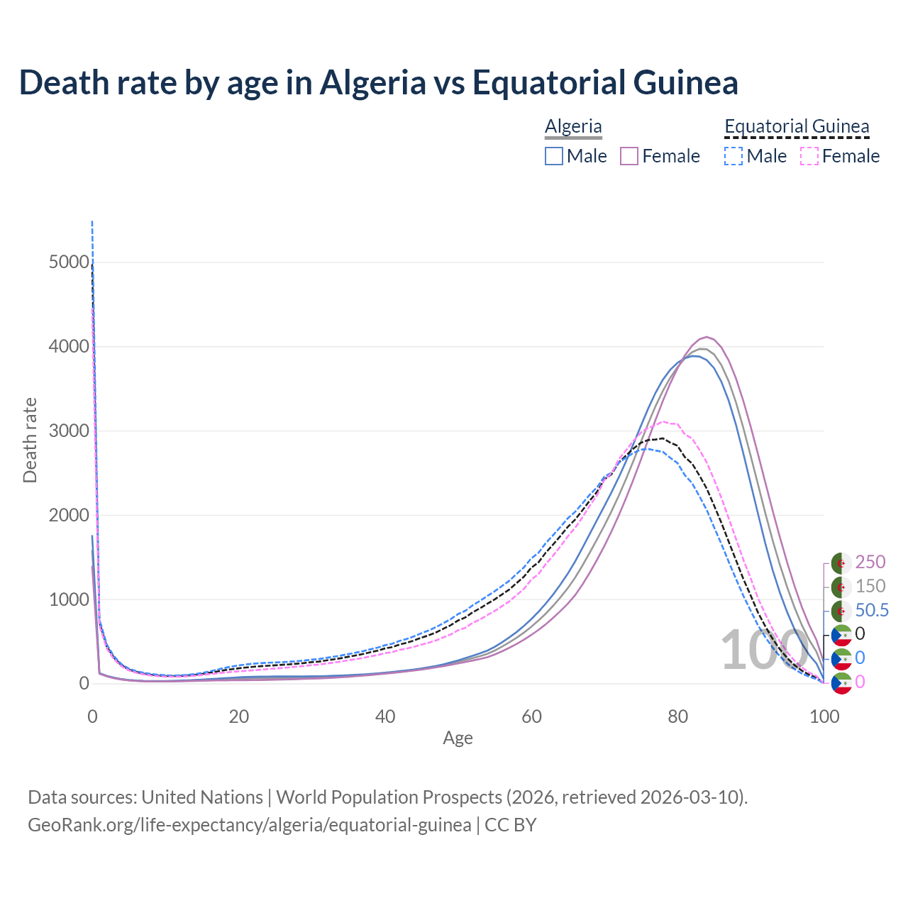 In Algeria, the most common age of death is 83, compared to 0 in Equatorial Guinea. The median age of death is 80.4 in Algeria and 71.3 in Equatorial Guinea, meaning only half of each cohort is expected to live past that age.