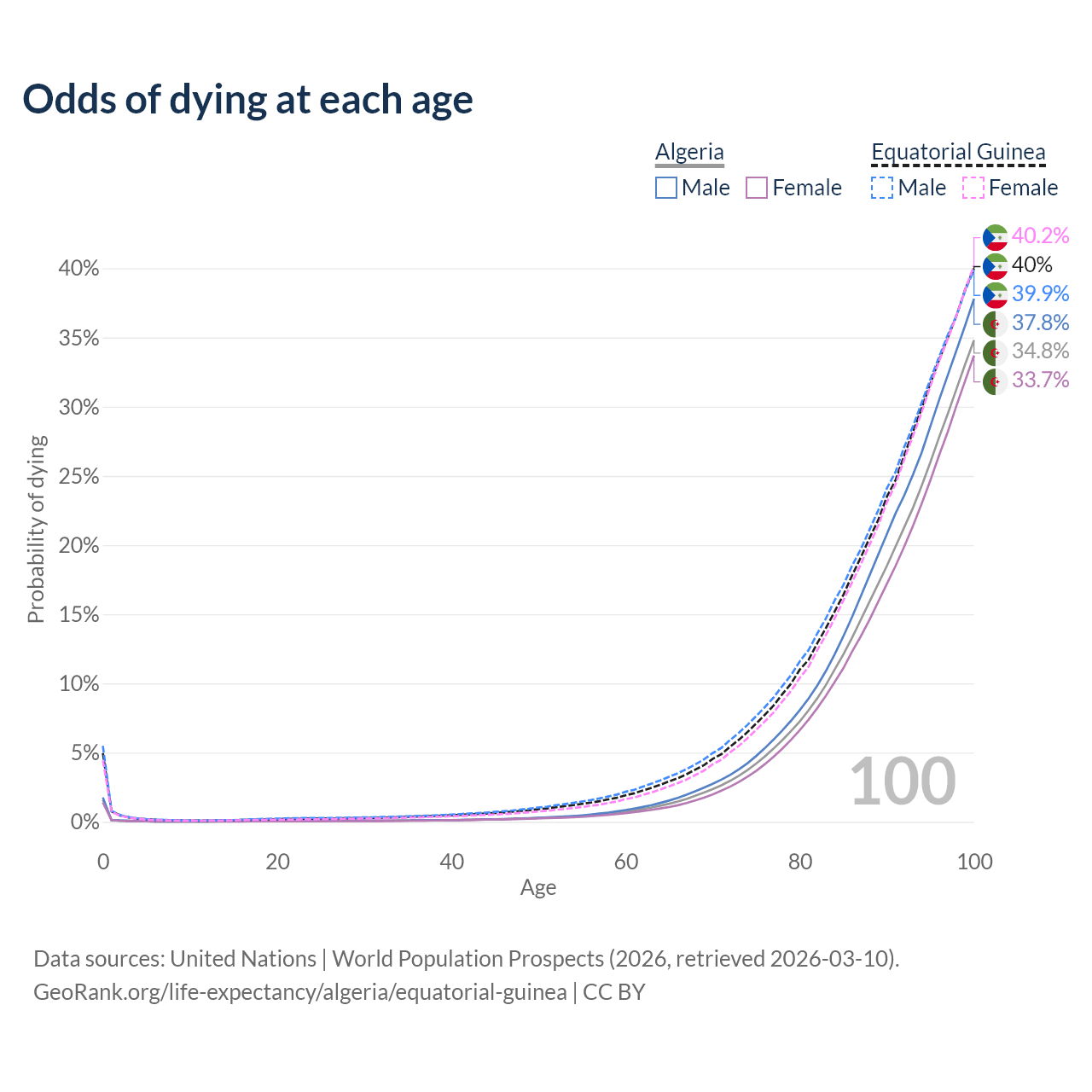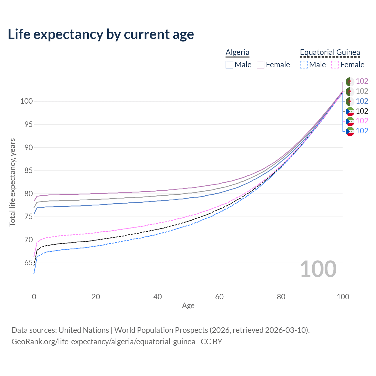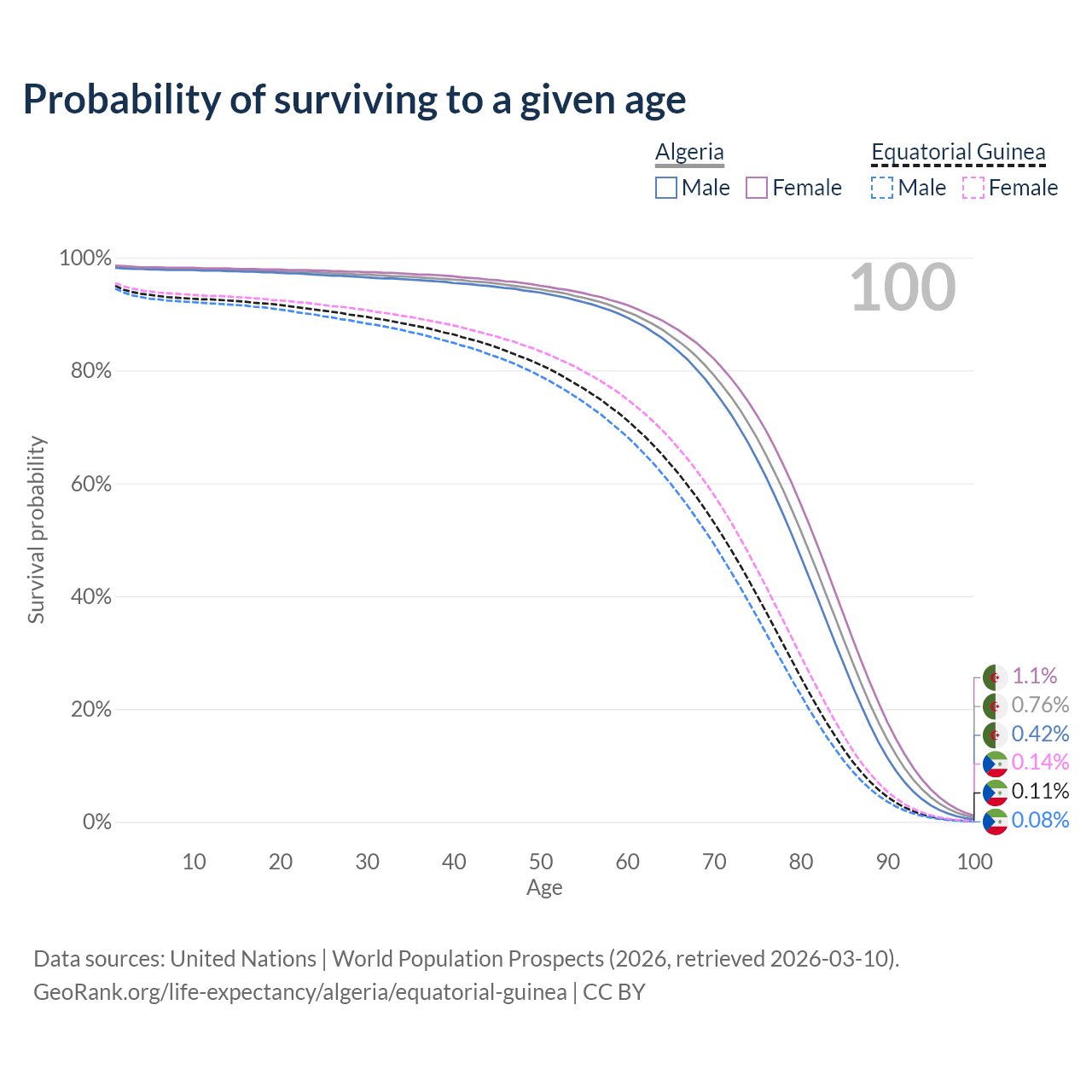 This life expectancy calculator shows the odds of living to 100, 95, 90, and below based on current age for both males and females in Algeria and Equatorial Guinea, along with mean and median age of death. The calculations are based on the 2026 life tables (actuarial tables) from the UN World Population Prospects.