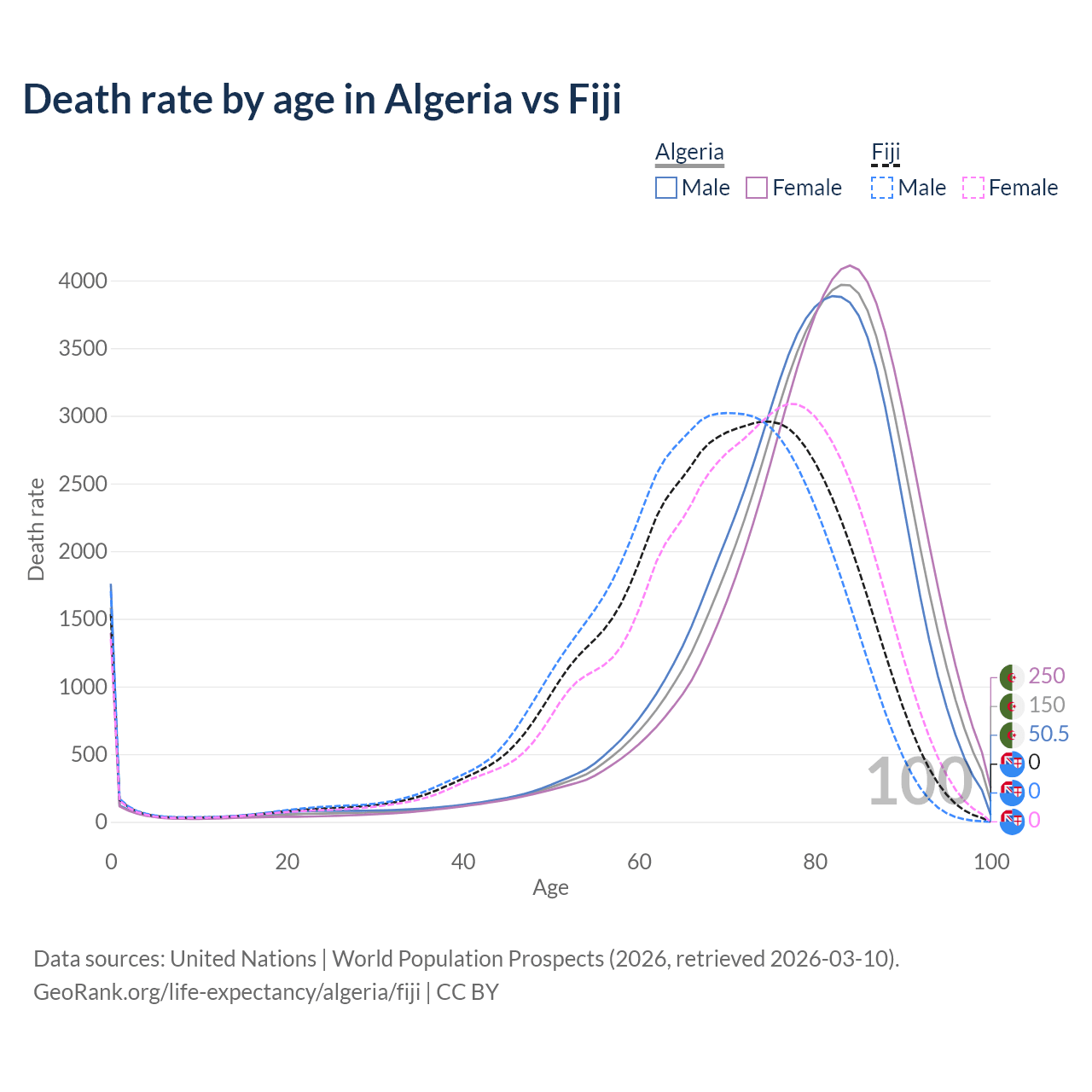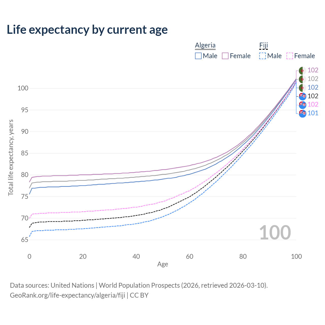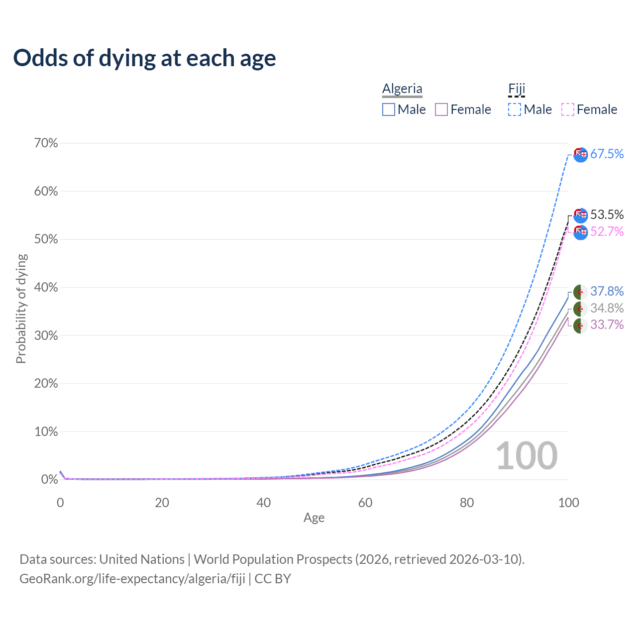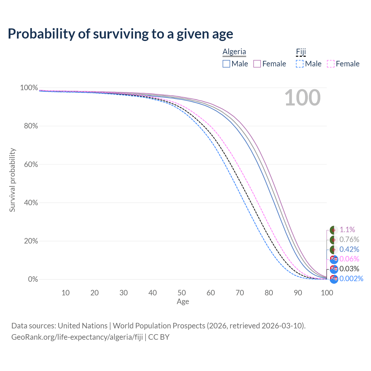 This life expectancy calculator shows the odds of living to 100, 95, 90, and below based on current age for both males and females in Algeria and Fiji, along with mean and median age of death. The calculations are based on the 2026 life tables (actuarial tables) from the UN World Population Prospects.