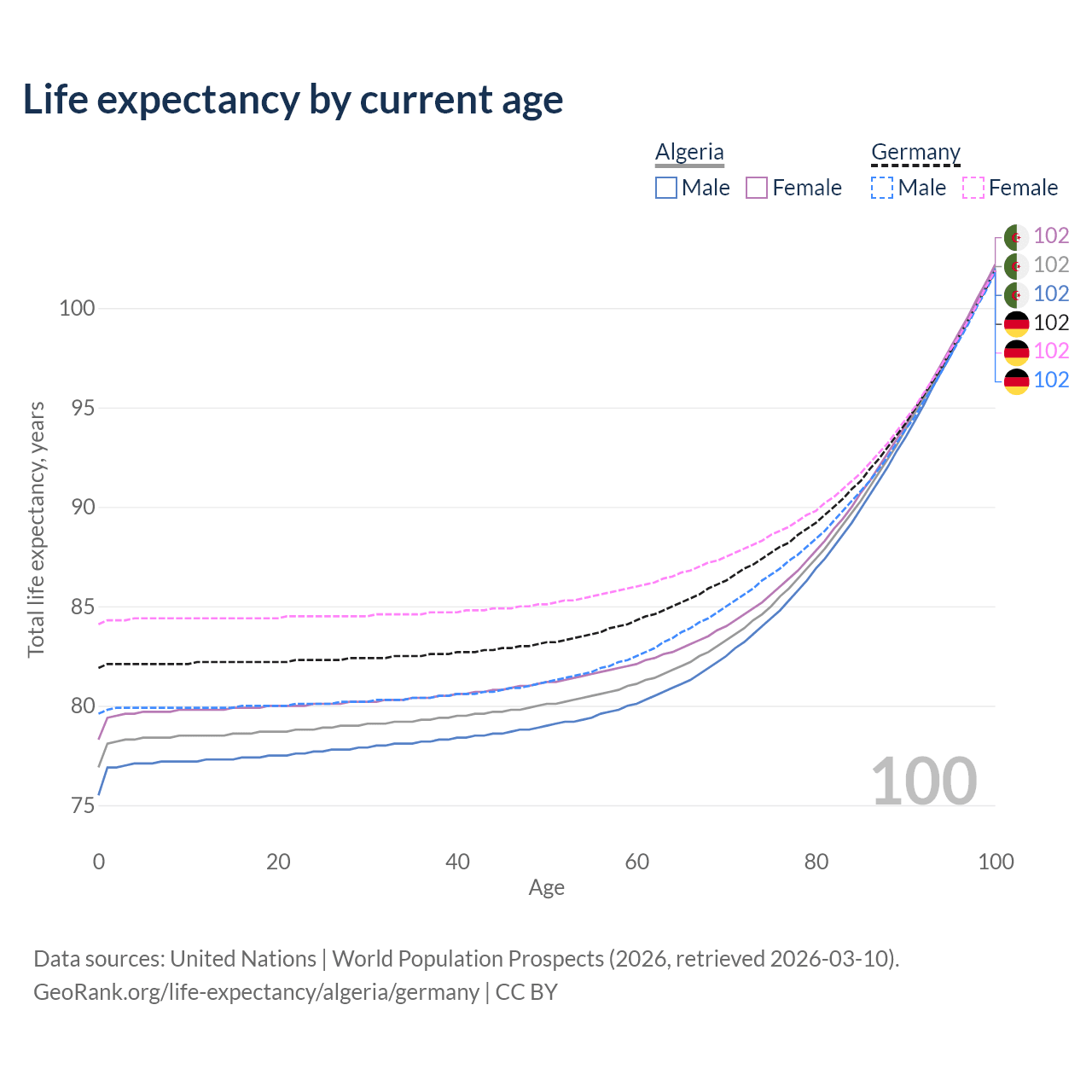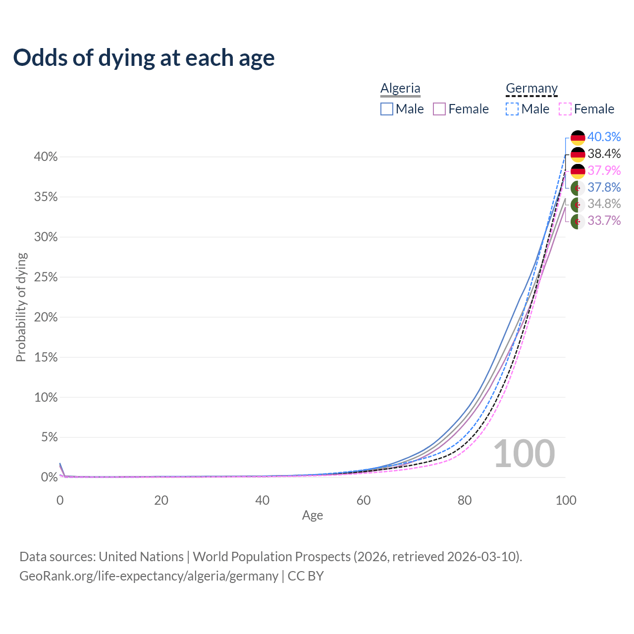 This life expectancy calculator shows the odds of living to 100, 95, 90, and below based on current age for both males and females in Algeria and Germany, along with mean and median age of death. The calculations are based on the 2026 life tables (actuarial tables) from the UN World Population Prospects.