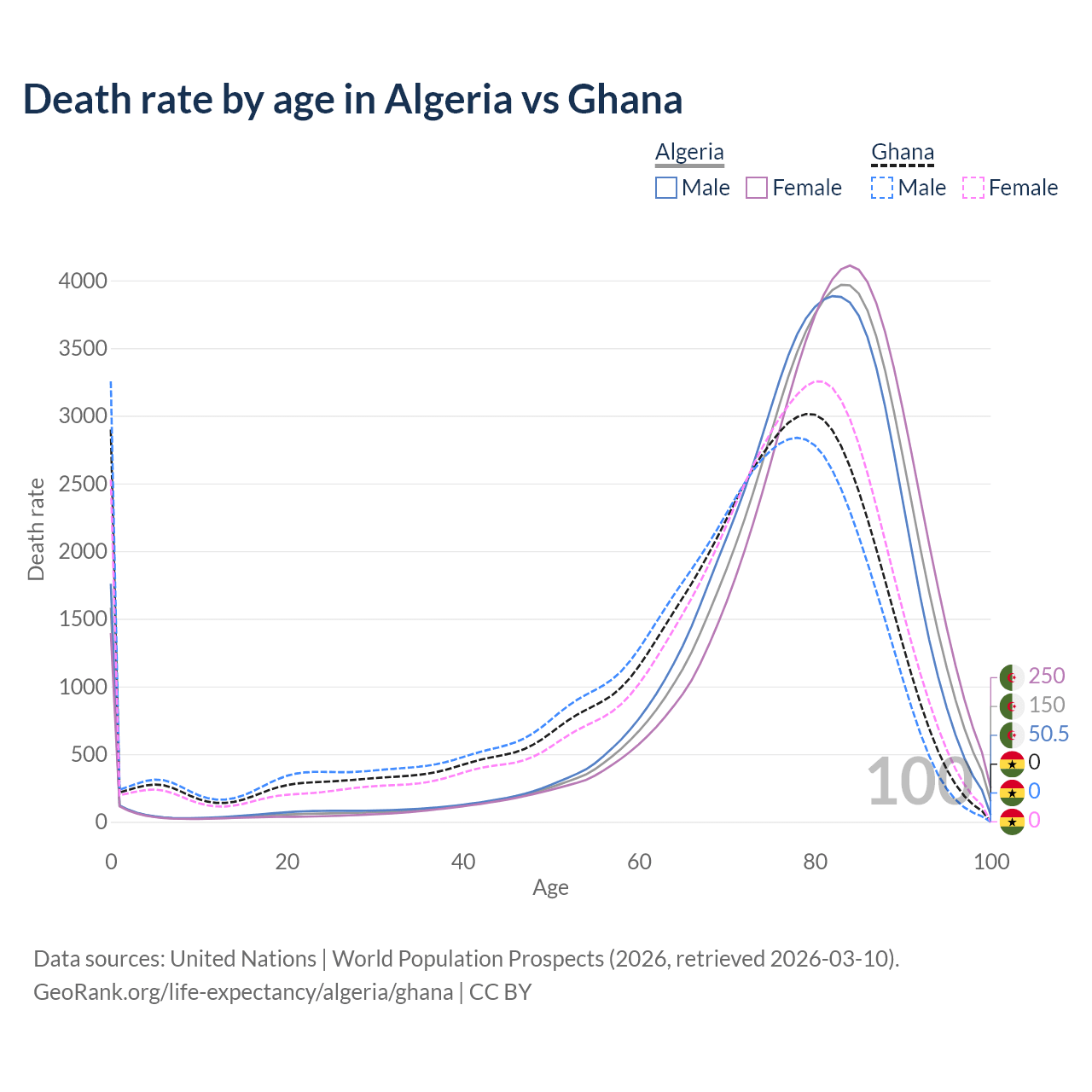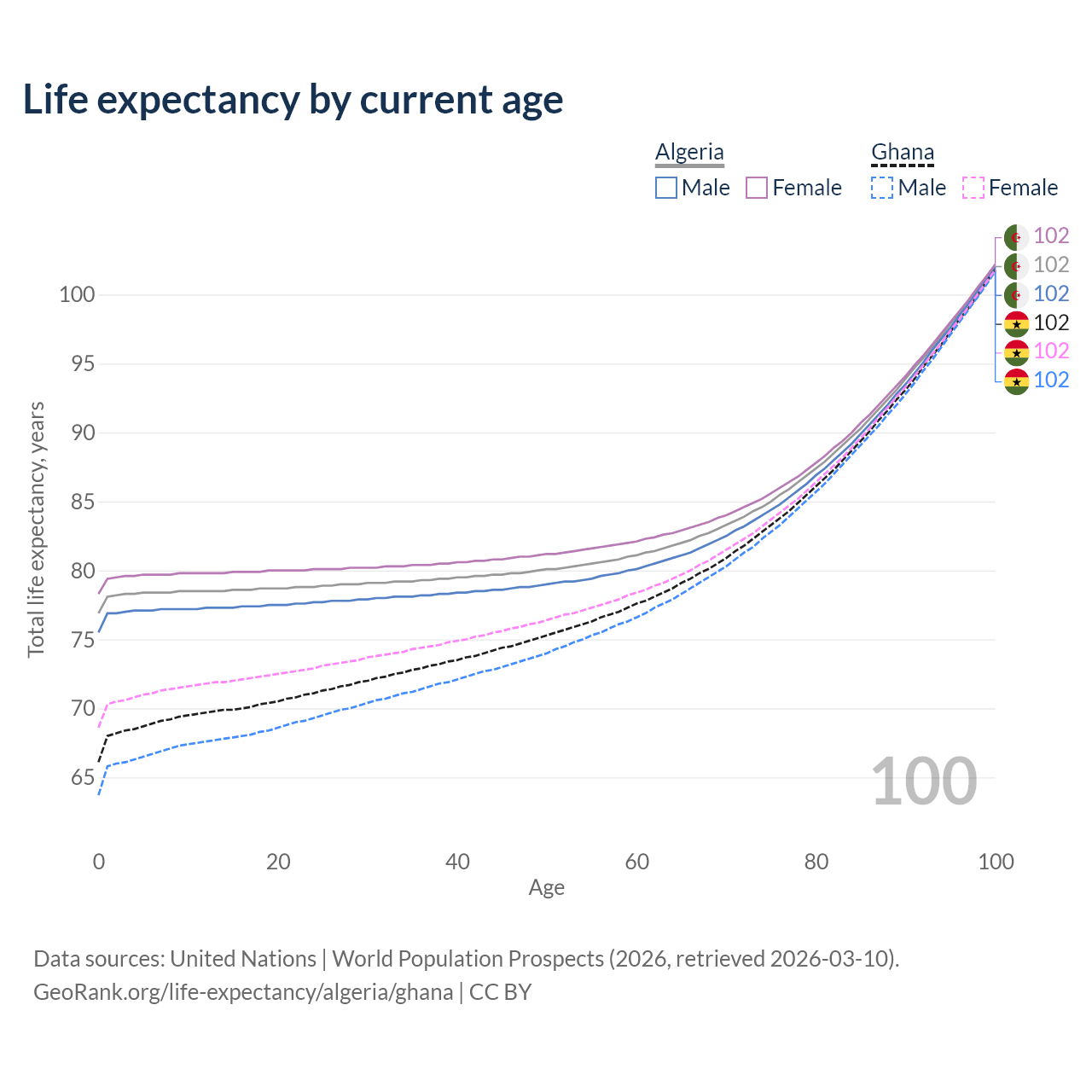 This life expectancy calculator shows the odds of living to 100, 95, 90, and below based on current age for both males and females in Algeria and Ghana, along with mean and median age of death. The calculations are based on the 2026 life tables (actuarial tables) from the UN World Population Prospects.