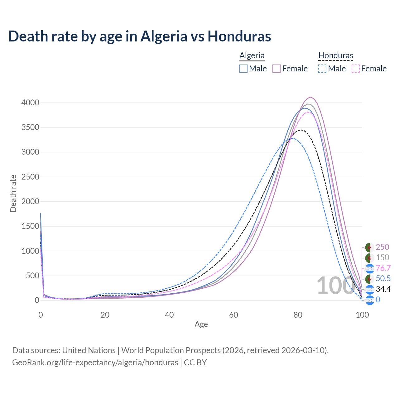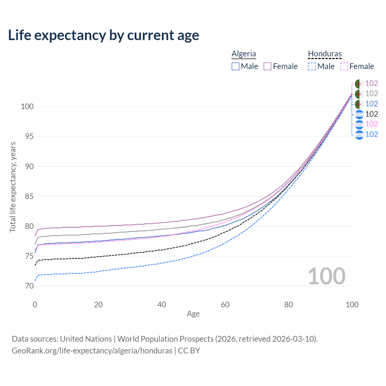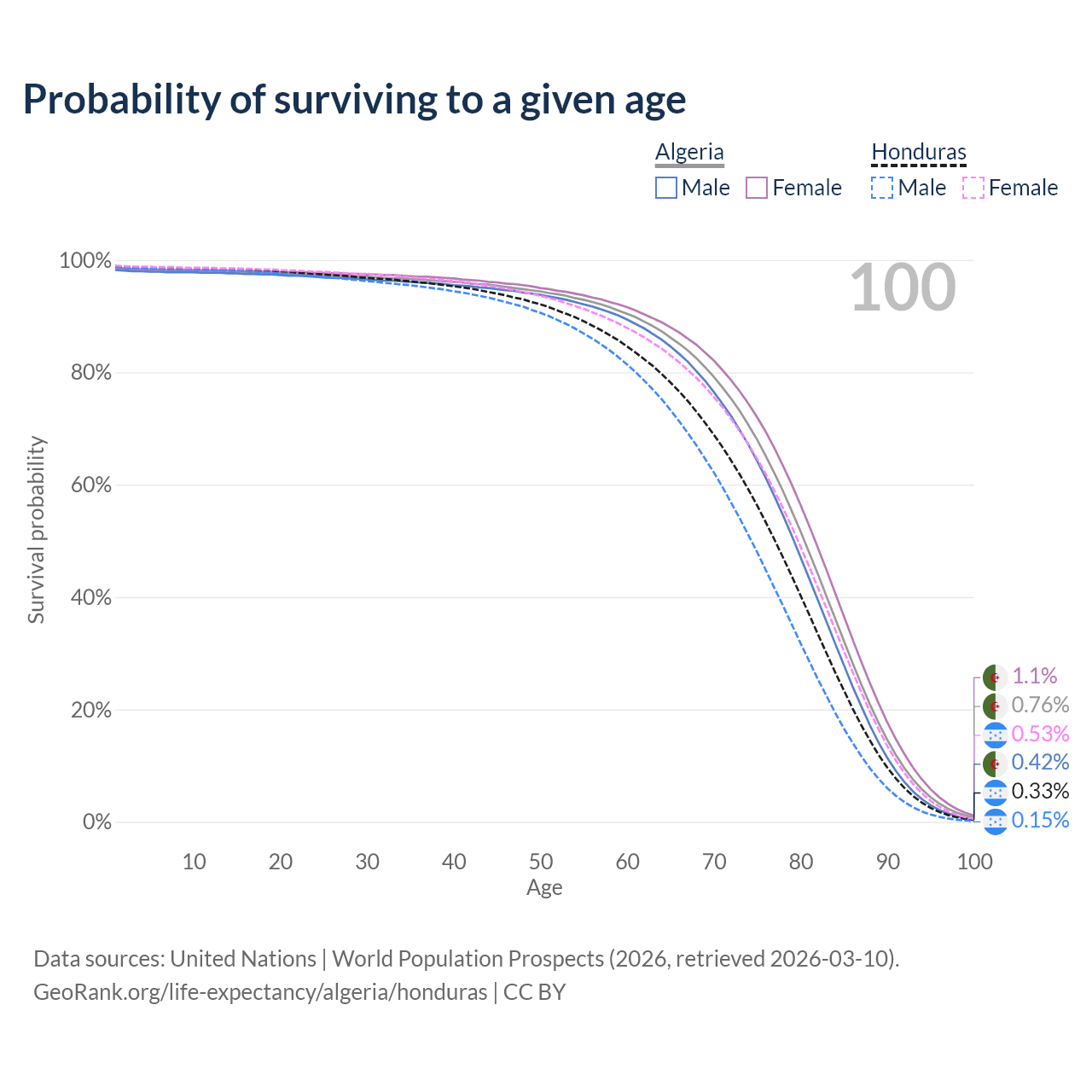 This life expectancy calculator shows the odds of living to 100, 95, 90, and below based on current age for both males and females in Algeria and Honduras, along with mean and median age of death. The calculations are based on the 2026 life tables (actuarial tables) from the UN World Population Prospects.