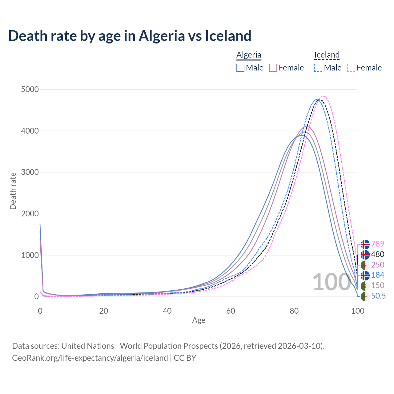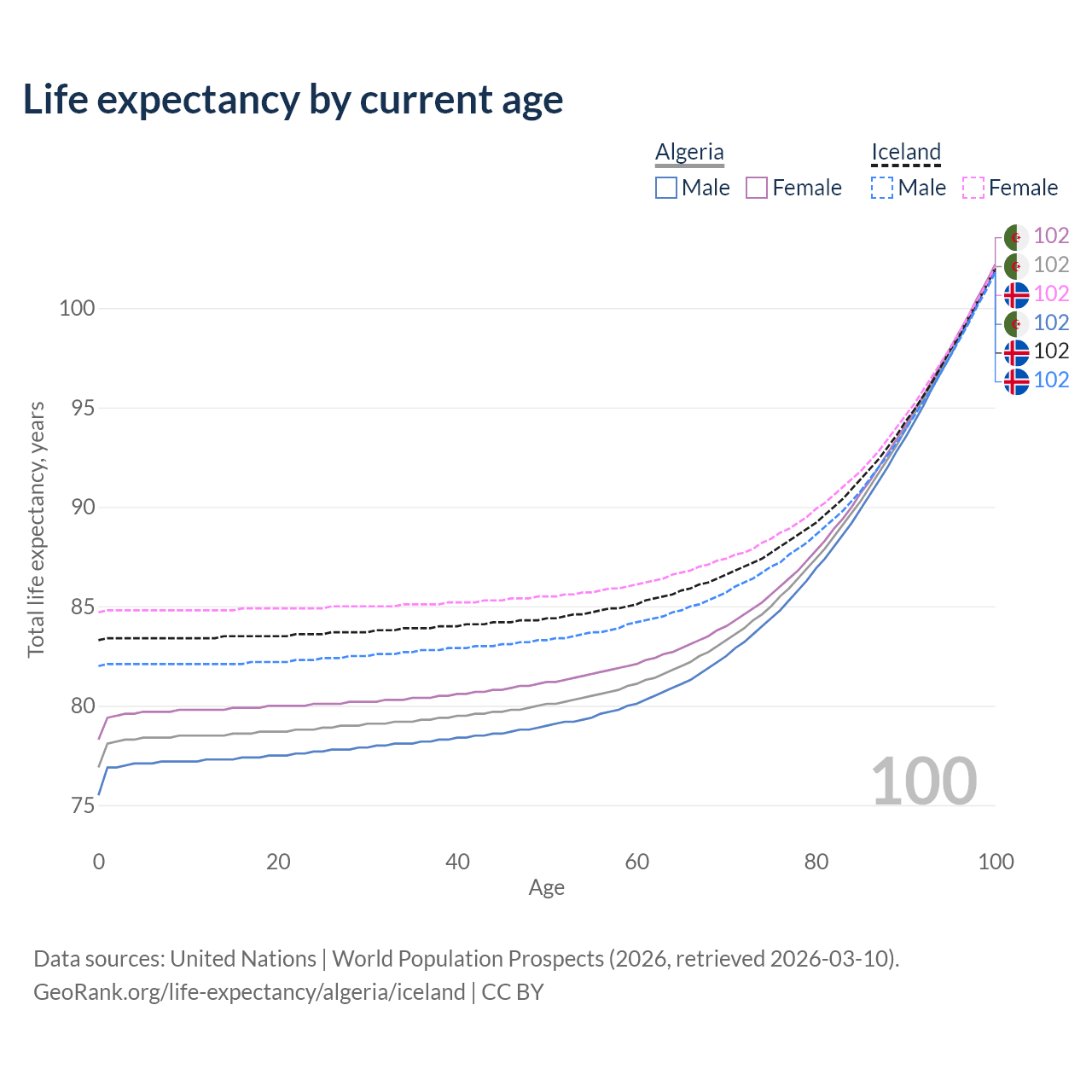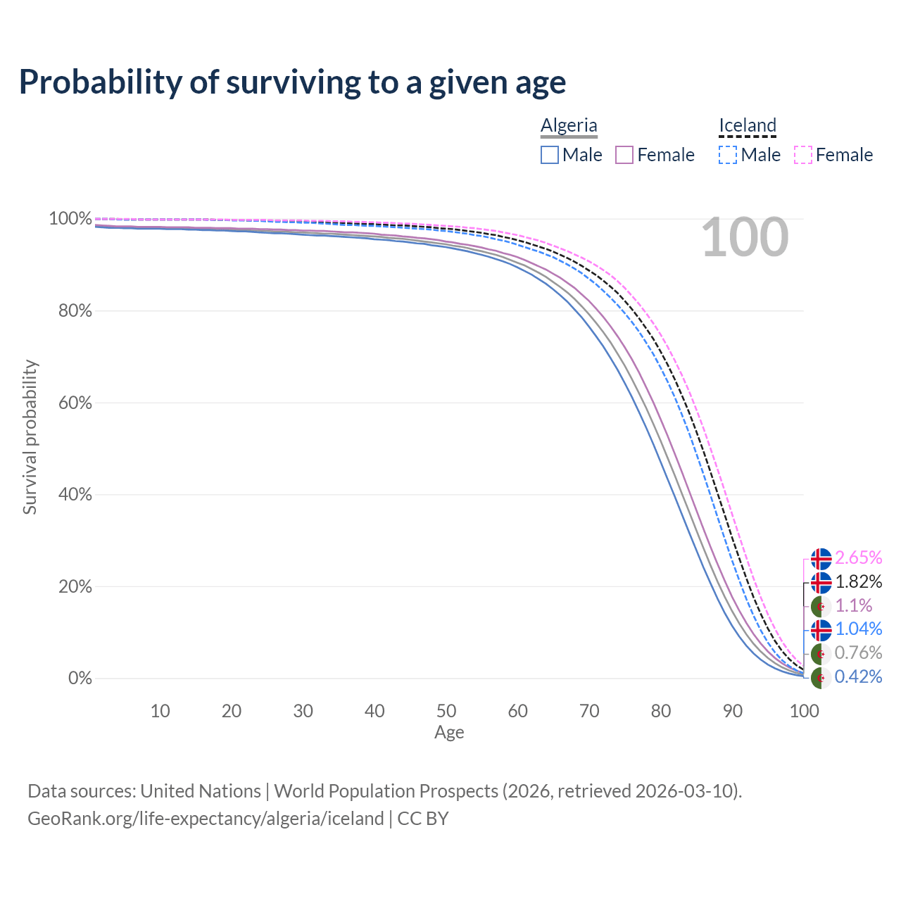 This life expectancy calculator shows the odds of living to 100, 95, 90, and below based on current age for both males and females in Algeria and Iceland, along with mean and median age of death. The calculations are based on the 2026 life tables (actuarial tables) from the UN World Population Prospects.