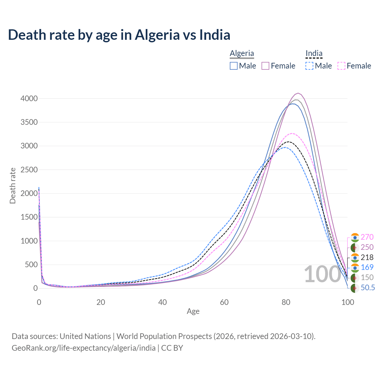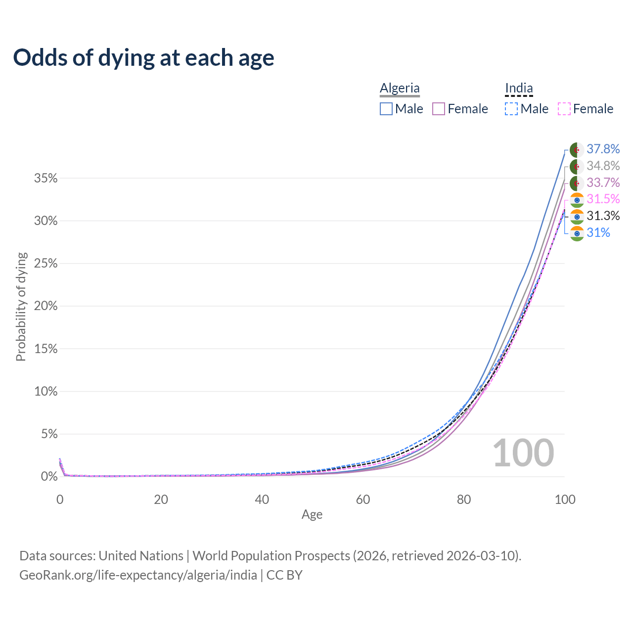 This life expectancy calculator shows the odds of living to 100, 95, 90, and below based on current age for both males and females in Algeria and India, along with mean and median age of death. The calculations are based on the 2026 life tables (actuarial tables) from the UN World Population Prospects.