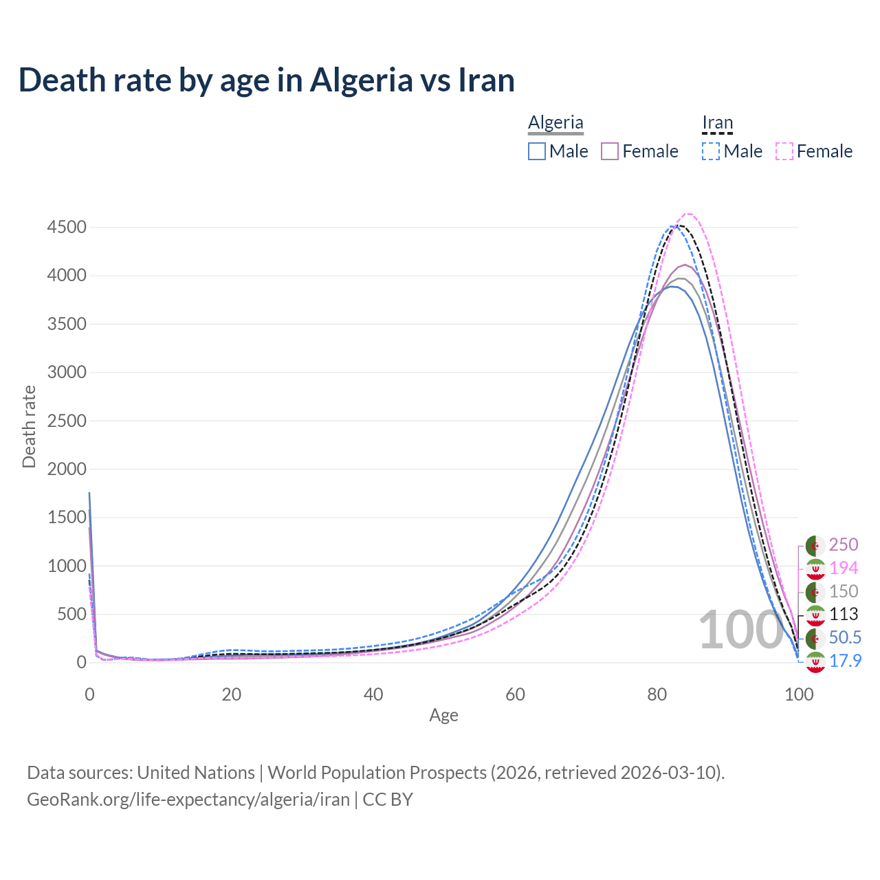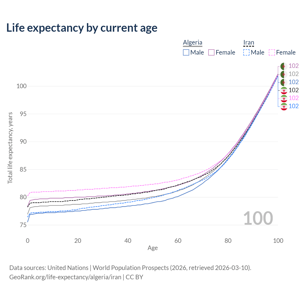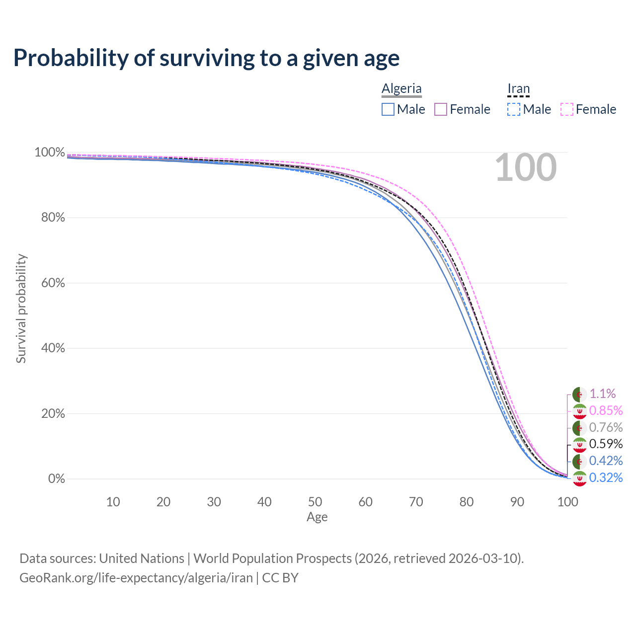 This life expectancy calculator shows the odds of living to 100, 95, 90, and below based on current age for both males and females in Algeria and Iran, along with mean and median age of death. The calculations are based on the 2026 life tables (actuarial tables) from the UN World Population Prospects.