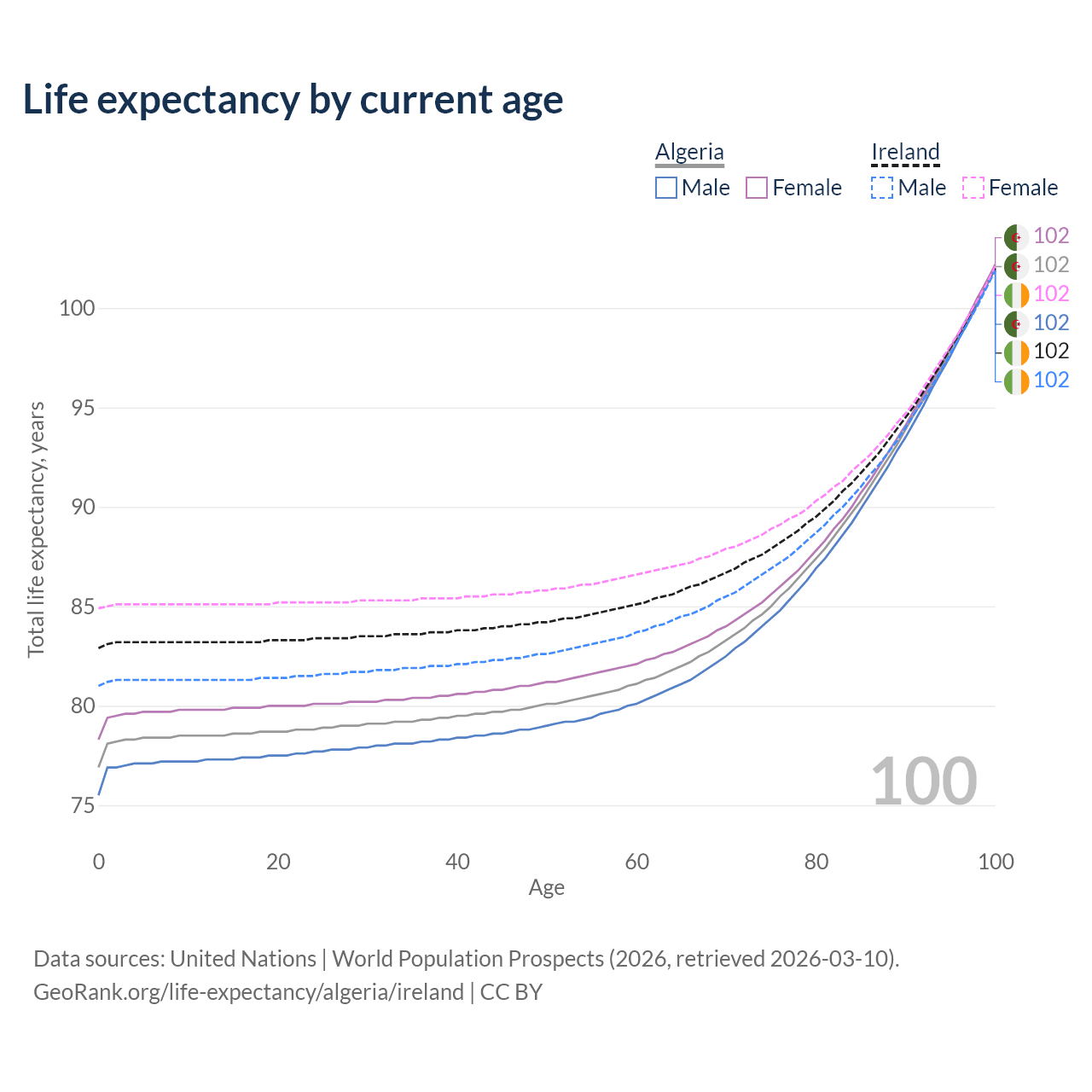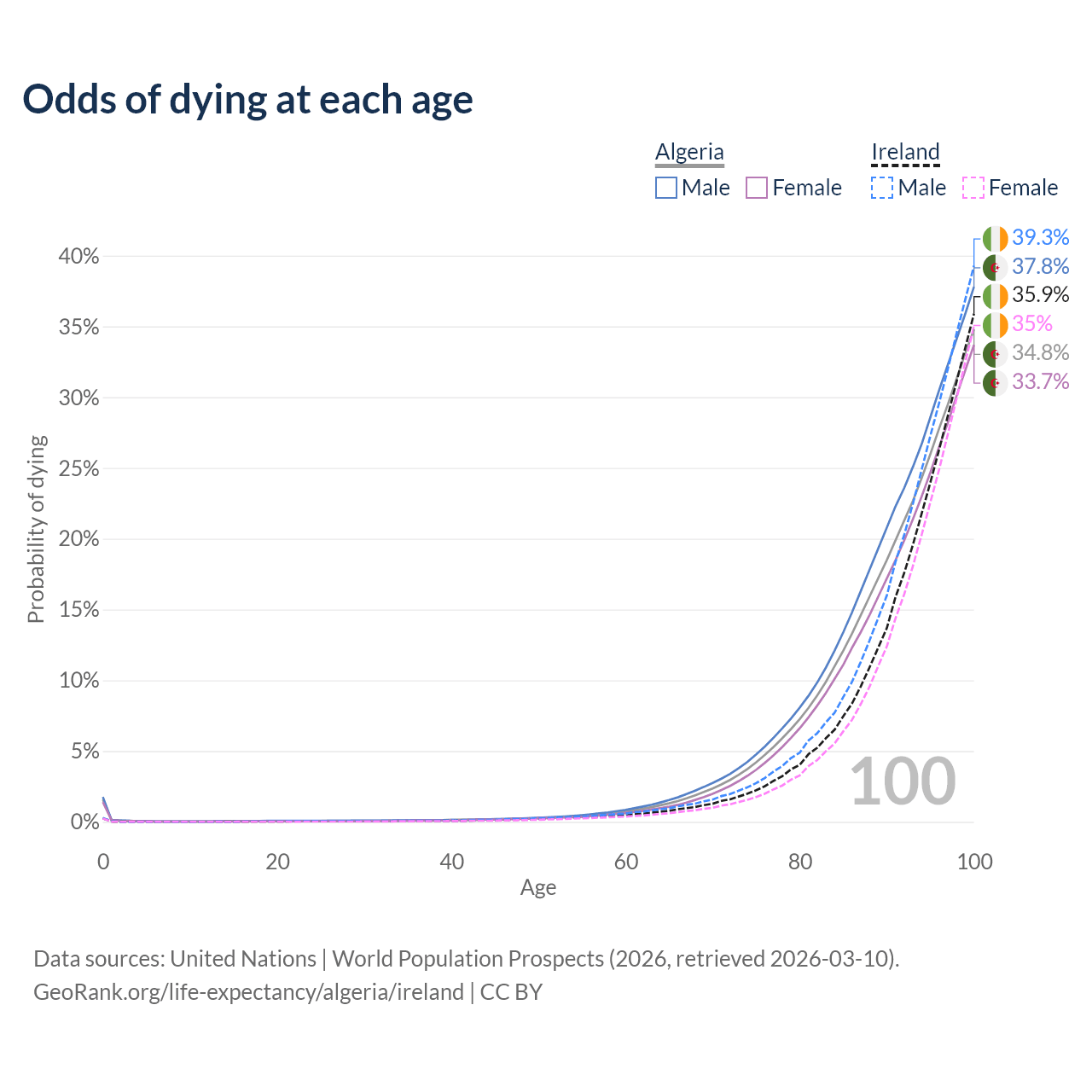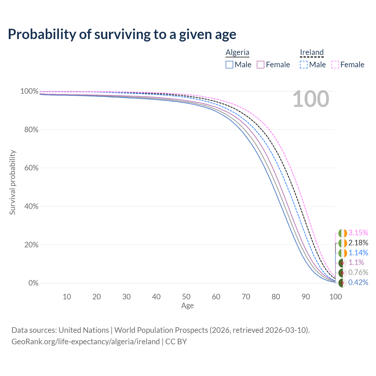 This life expectancy calculator shows the odds of living to 100, 95, 90, and below based on current age for both males and females in Algeria and Ireland, along with mean and median age of death. The calculations are based on the 2026 life tables (actuarial tables) from the UN World Population Prospects.