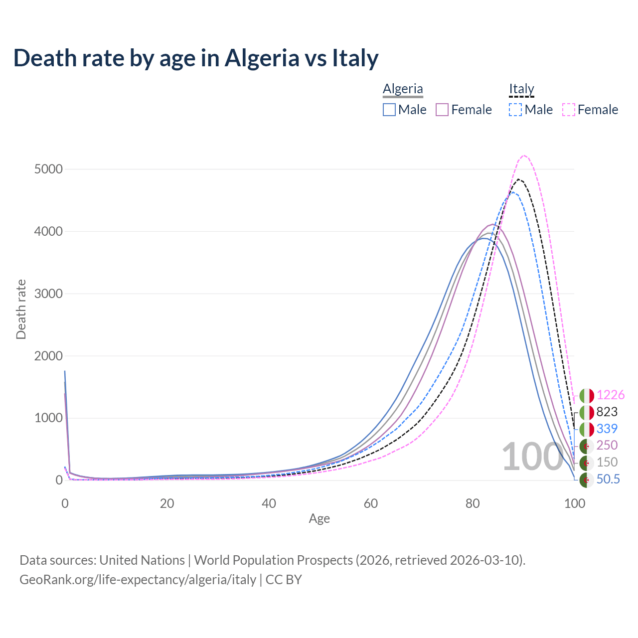 In Algeria, the most common age of death is 83, compared to 89 in Italy. The median age of death is 80.4 in Algeria and 86.9 in Italy, meaning only half of each cohort is expected to live past that age.