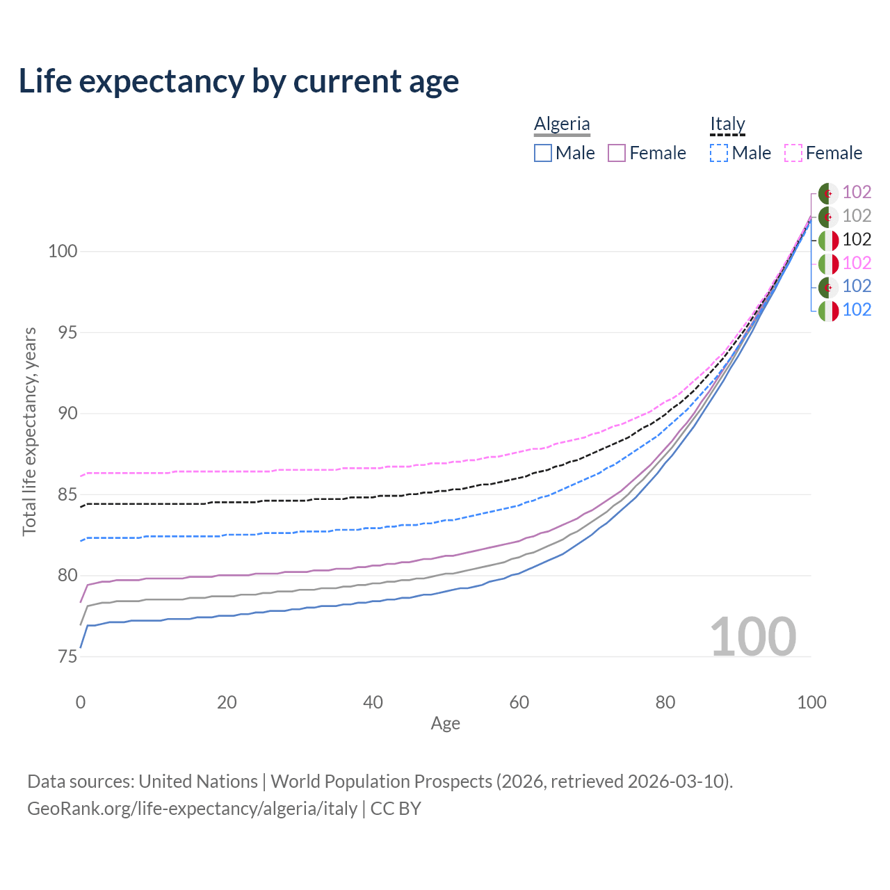 This life expectancy calculator shows the odds of living to 100, 95, 90, and below based on current age for both males and females in Algeria and Italy, along with mean and median age of death. The calculations are based on the 2026 life tables (actuarial tables) from the UN World Population Prospects.