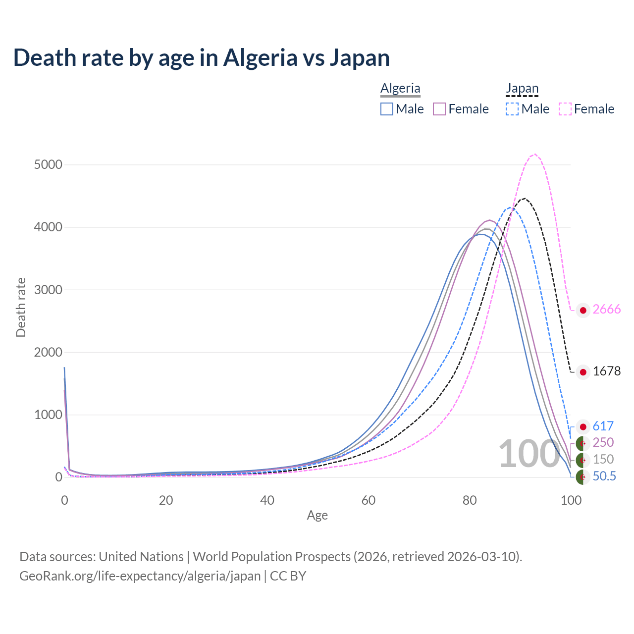 In Algeria, the most common age of death is 83, compared to 91 in Japan. The median age of death is 80.4 in Algeria and 88.1 in Japan, meaning only half of each cohort is expected to live past that age.