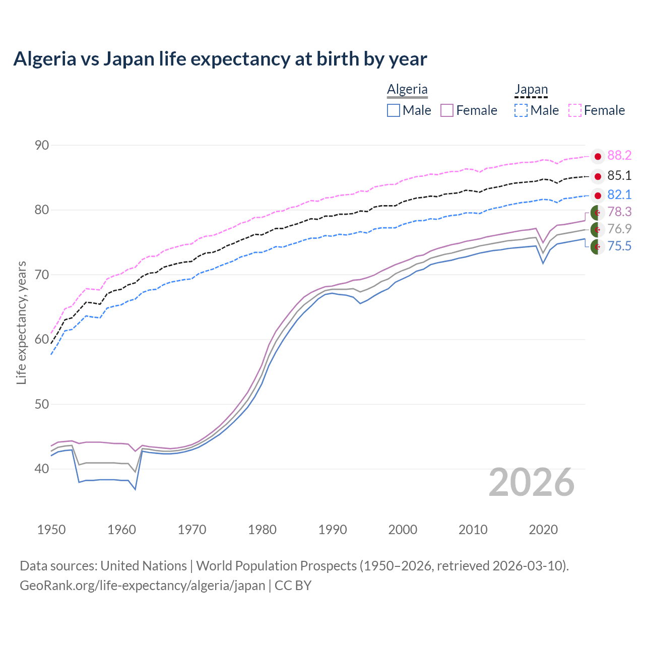 The average life expectancy at birth is 76.9 years in Algeria vs 85.1 in Japan. Algeria is ranked 76/197 by life expectancy, and Japan is 3/197. In Algeria, the life expectancy is 75.5 years for males and 78.3 years for females. In Japan, it's 82.1 years for males and 88.2 years for females.