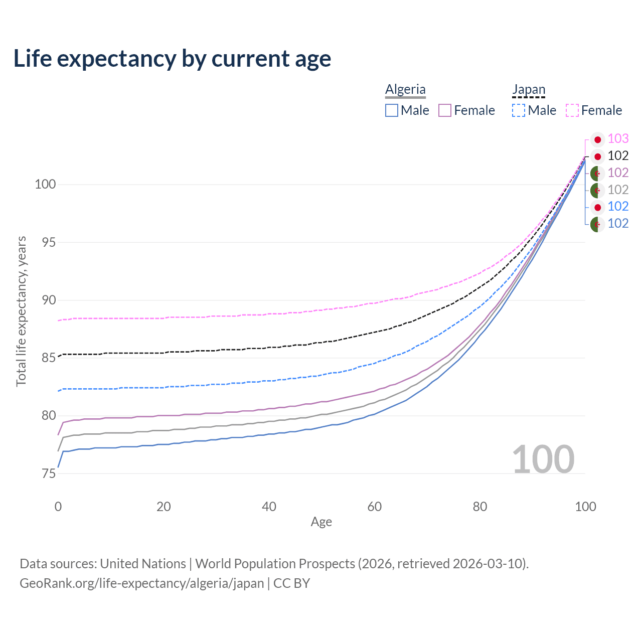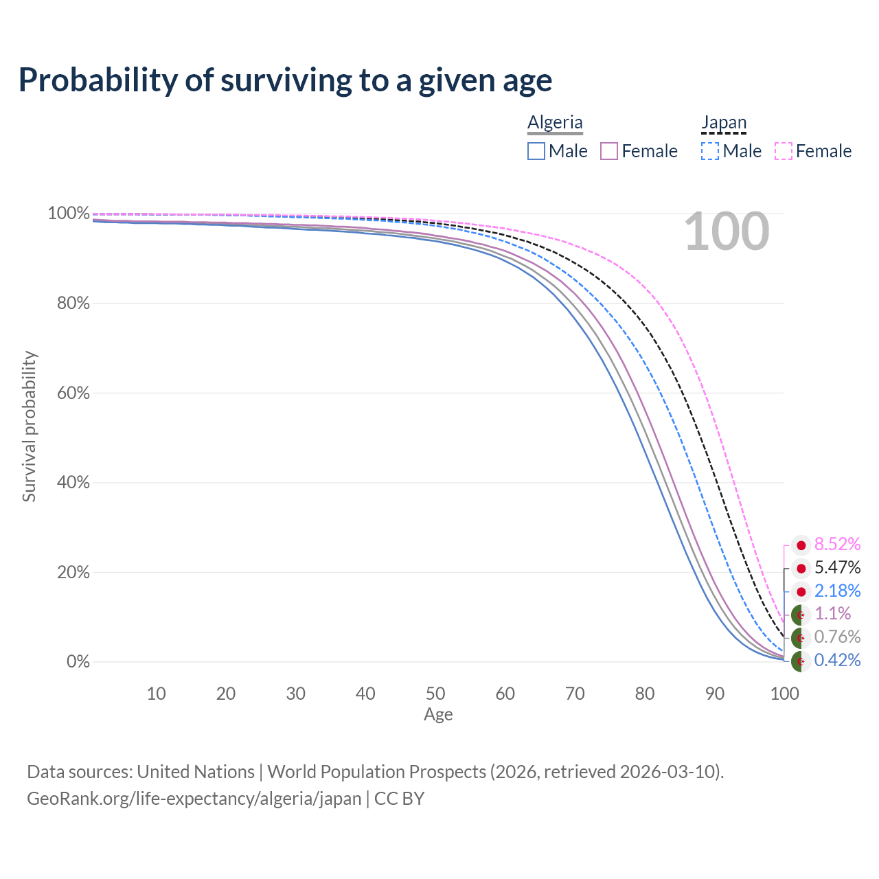 This life expectancy calculator shows the odds of living to 100, 95, 90, and below based on current age for both males and females in Algeria and Japan, along with mean and median age of death. The calculations are based on the 2026 life tables (actuarial tables) from the UN World Population Prospects.