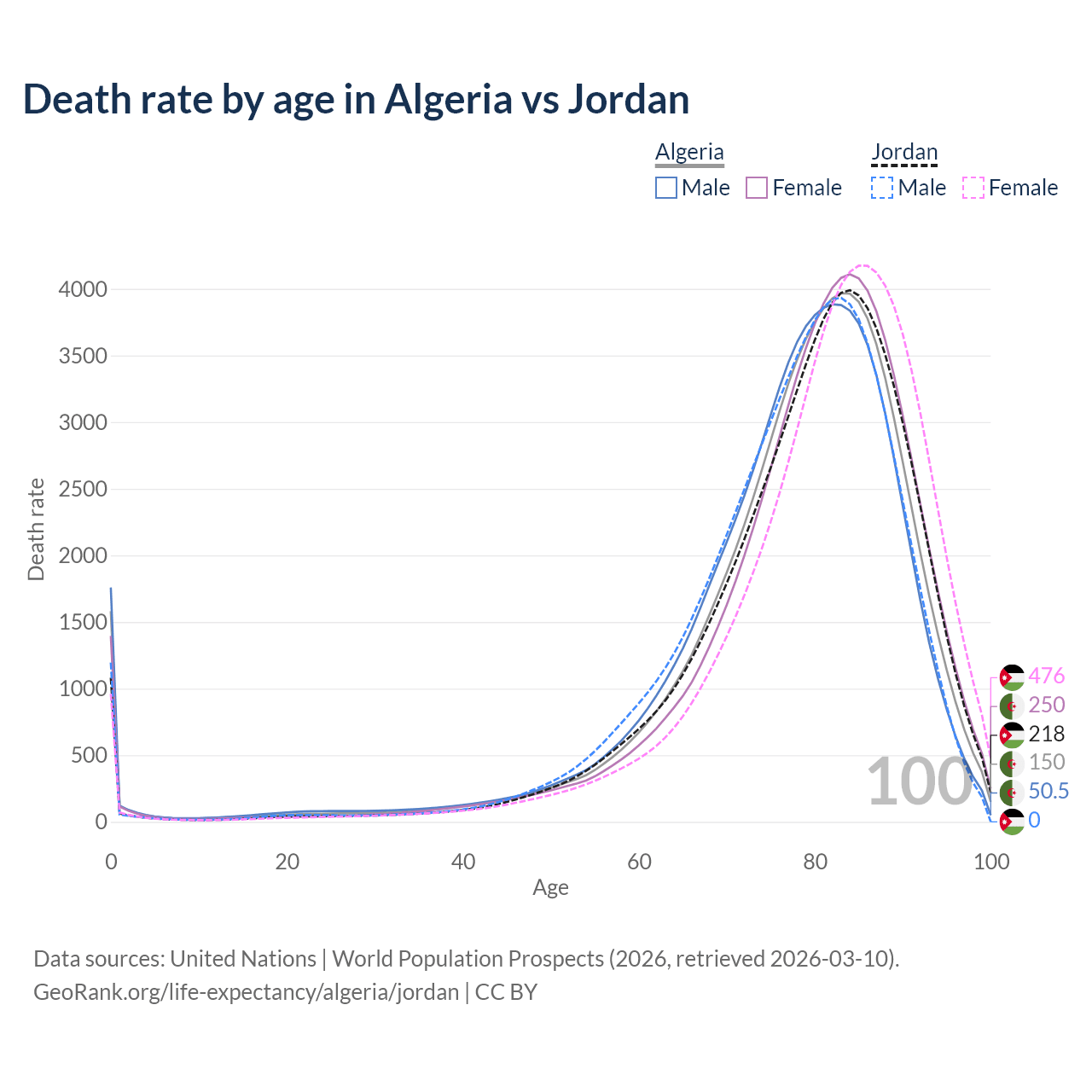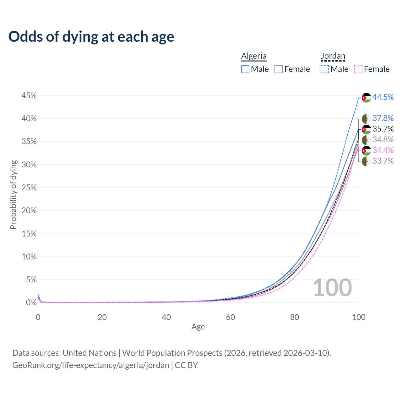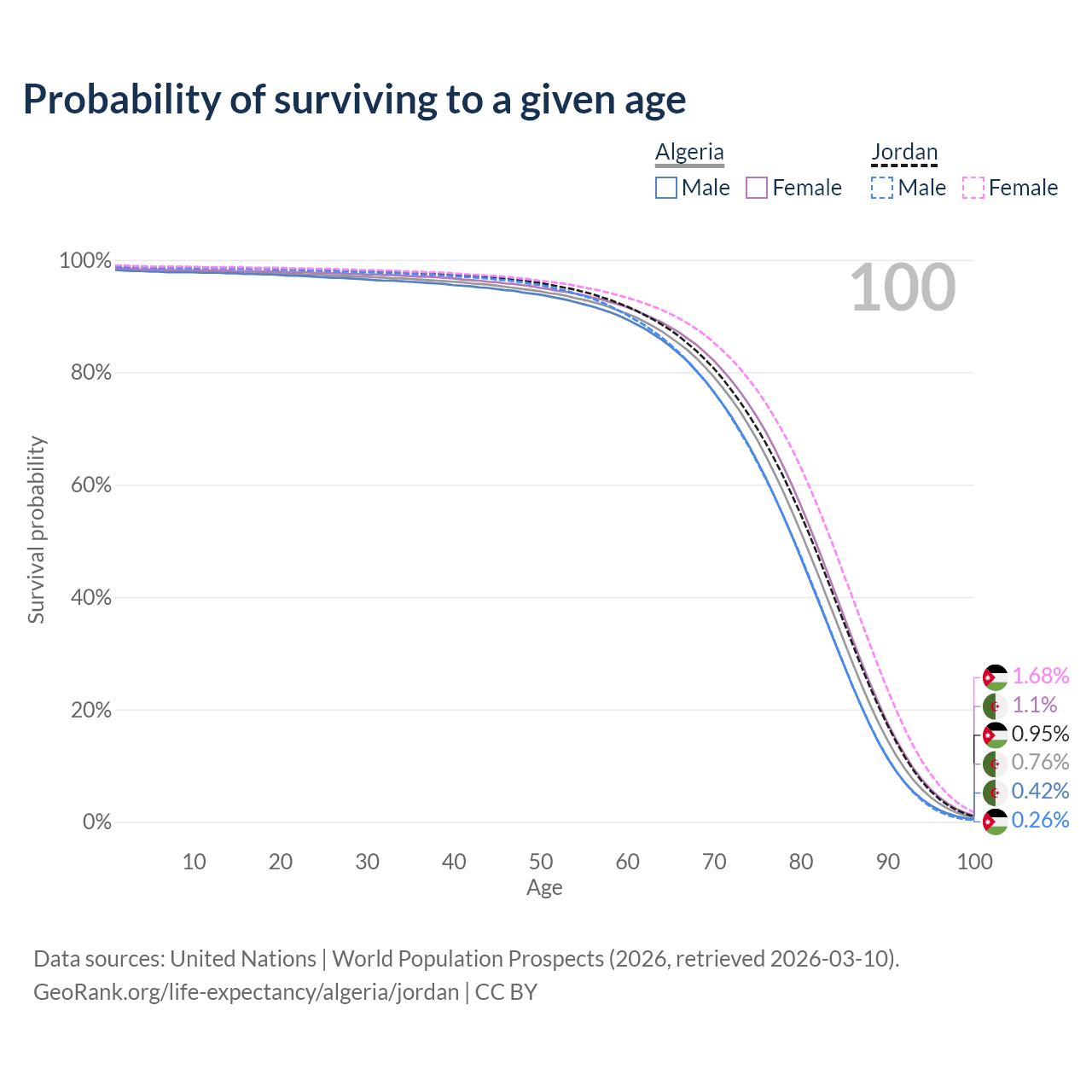 This life expectancy calculator shows the odds of living to 100, 95, 90, and below based on current age for both males and females in Algeria and Jordan, along with mean and median age of death. The calculations are based on the 2026 life tables (actuarial tables) from the UN World Population Prospects.