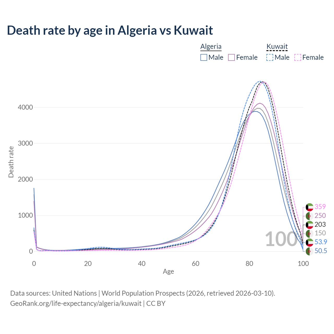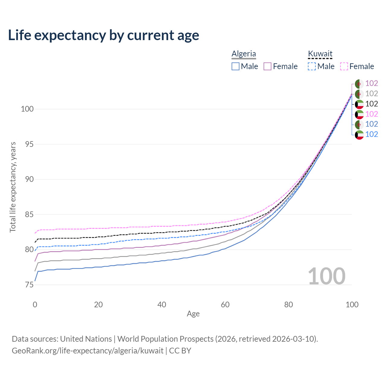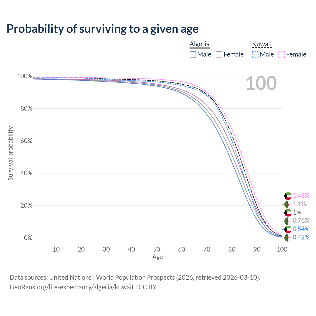 This life expectancy calculator shows the odds of living to 100, 95, 90, and below based on current age for both males and females in Algeria and Kuwait, along with mean and median age of death. The calculations are based on the 2026 life tables (actuarial tables) from the UN World Population Prospects.