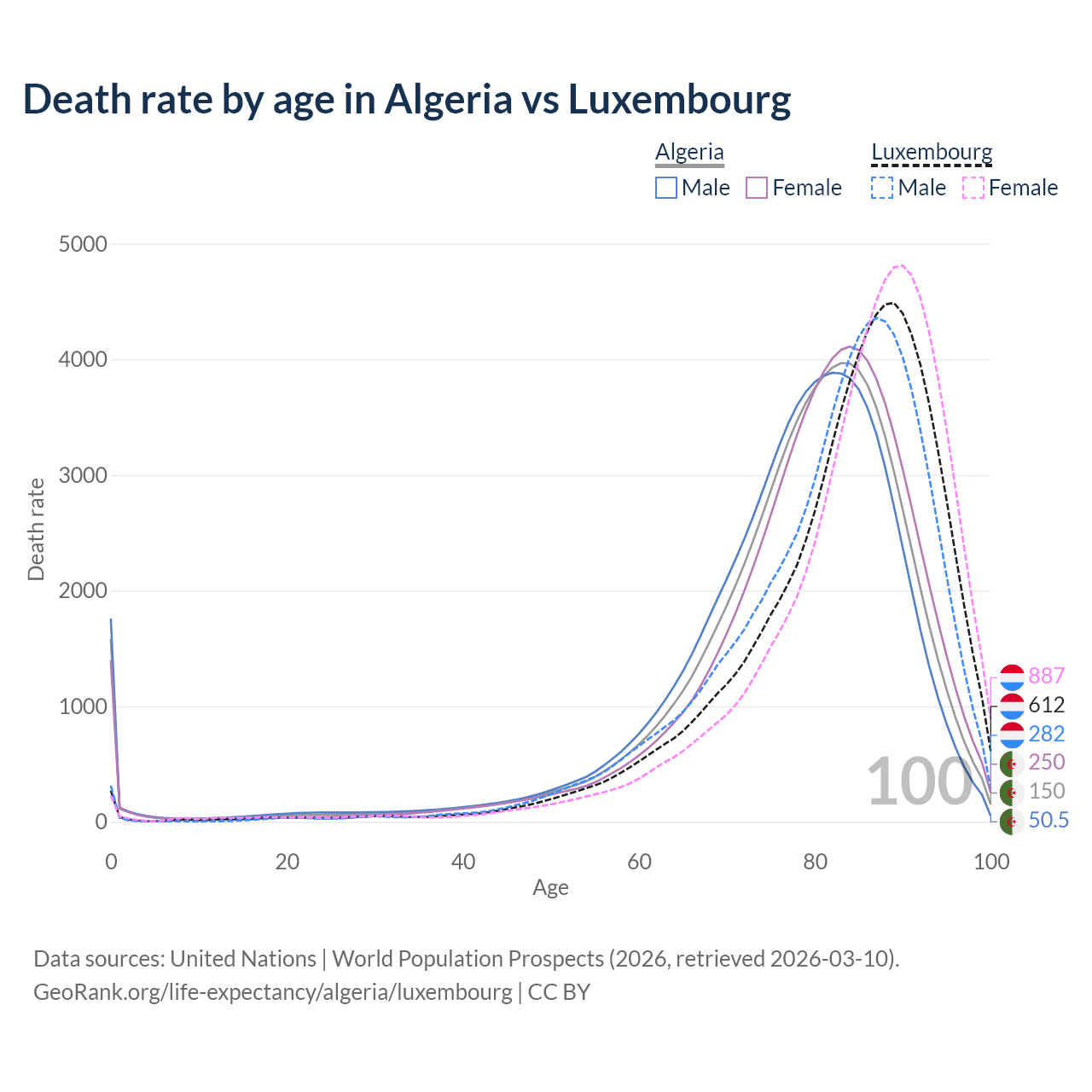 In Algeria, the most common age of death is 83, compared to 89 in Luxembourg. The median age of death is 80.4 in Algeria and 85.7 in Luxembourg, meaning only half of each cohort is expected to live past that age.