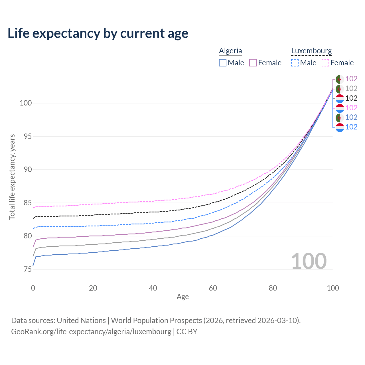 This life expectancy calculator shows the odds of living to 100, 95, 90, and below based on current age for both males and females in Algeria and Luxembourg, along with mean and median age of death. The calculations are based on the 2026 life tables (actuarial tables) from the UN World Population Prospects.