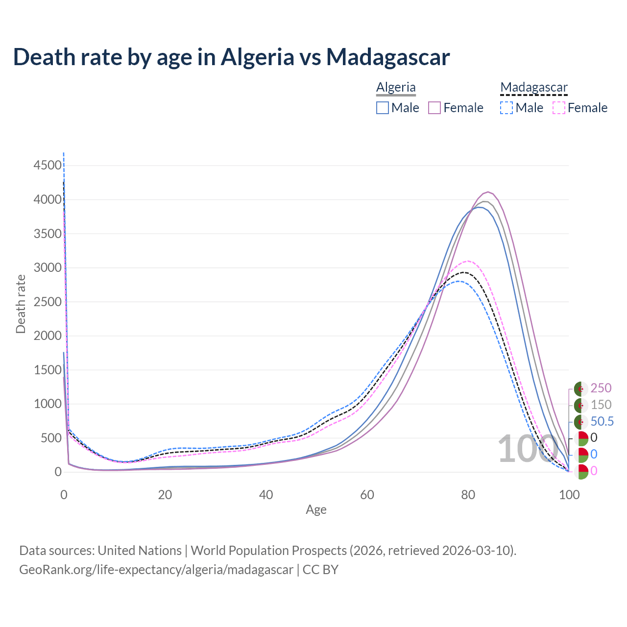 In Algeria, the most common age of death is 83, compared to 0 in Madagascar. The median age of death is 80.4 in Algeria and 72.2 in Madagascar, meaning only half of each cohort is expected to live past that age.
