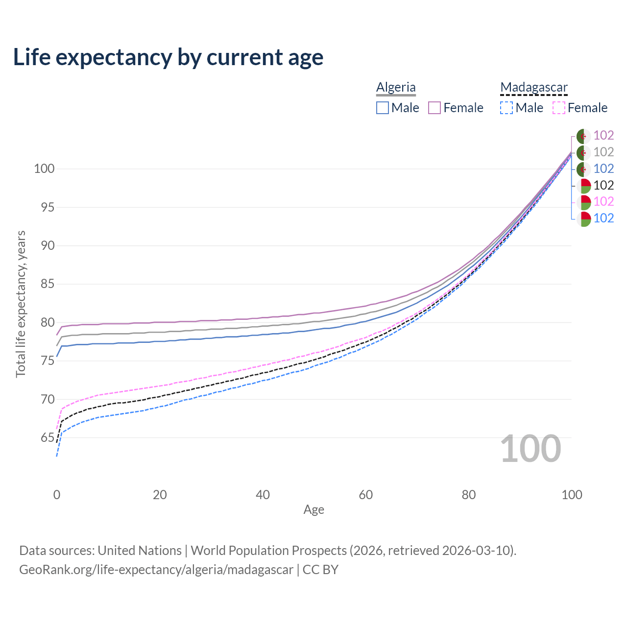 This life expectancy calculator shows the odds of living to 100, 95, 90, and below based on current age for both males and females in Algeria and Madagascar, along with mean and median age of death. The calculations are based on the 2026 life tables (actuarial tables) from the UN World Population Prospects.