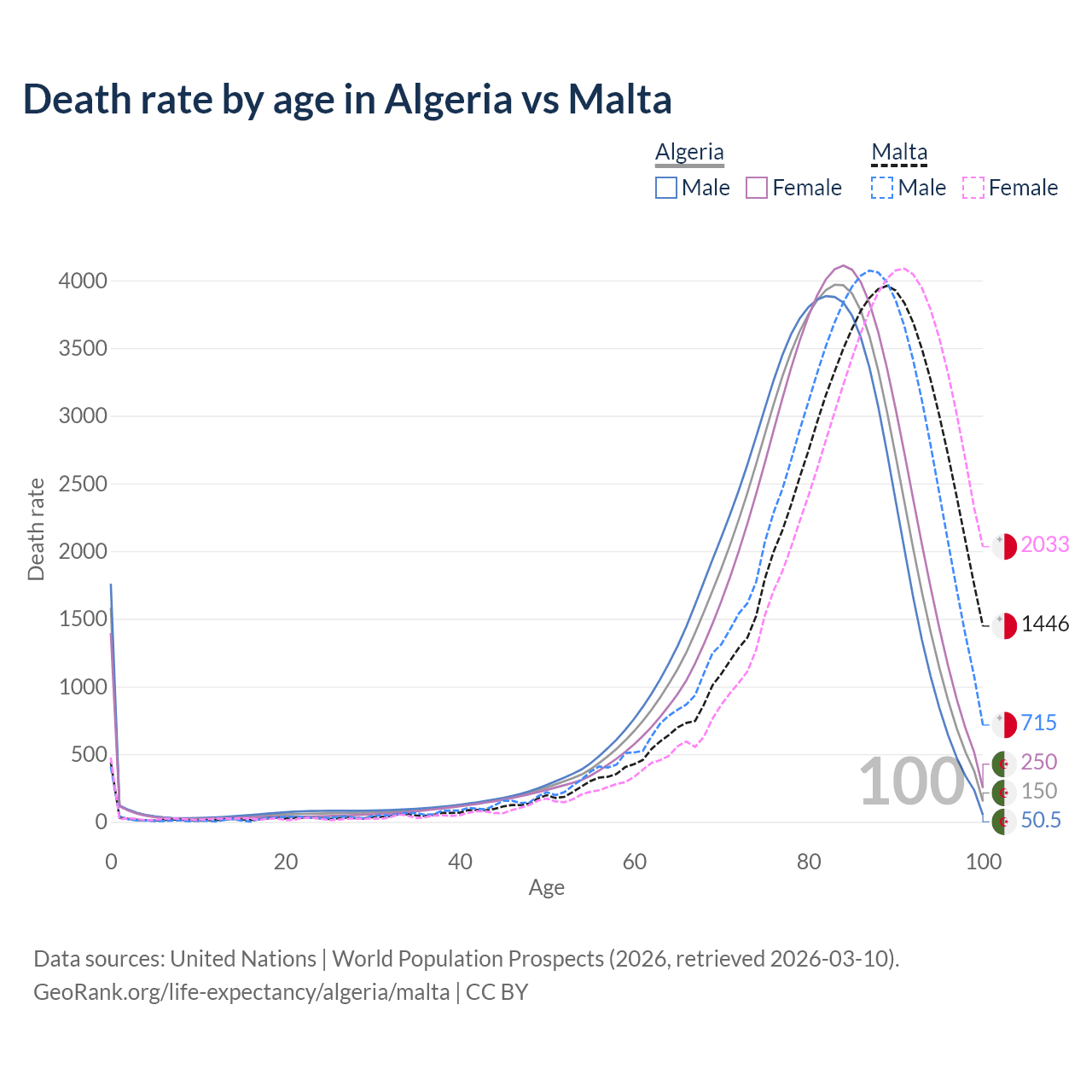 In Algeria, the most common age of death is 83, compared to 89 in Malta. The median age of death is 80.4 in Algeria and 86.3 in Malta, meaning only half of each cohort is expected to live past that age.