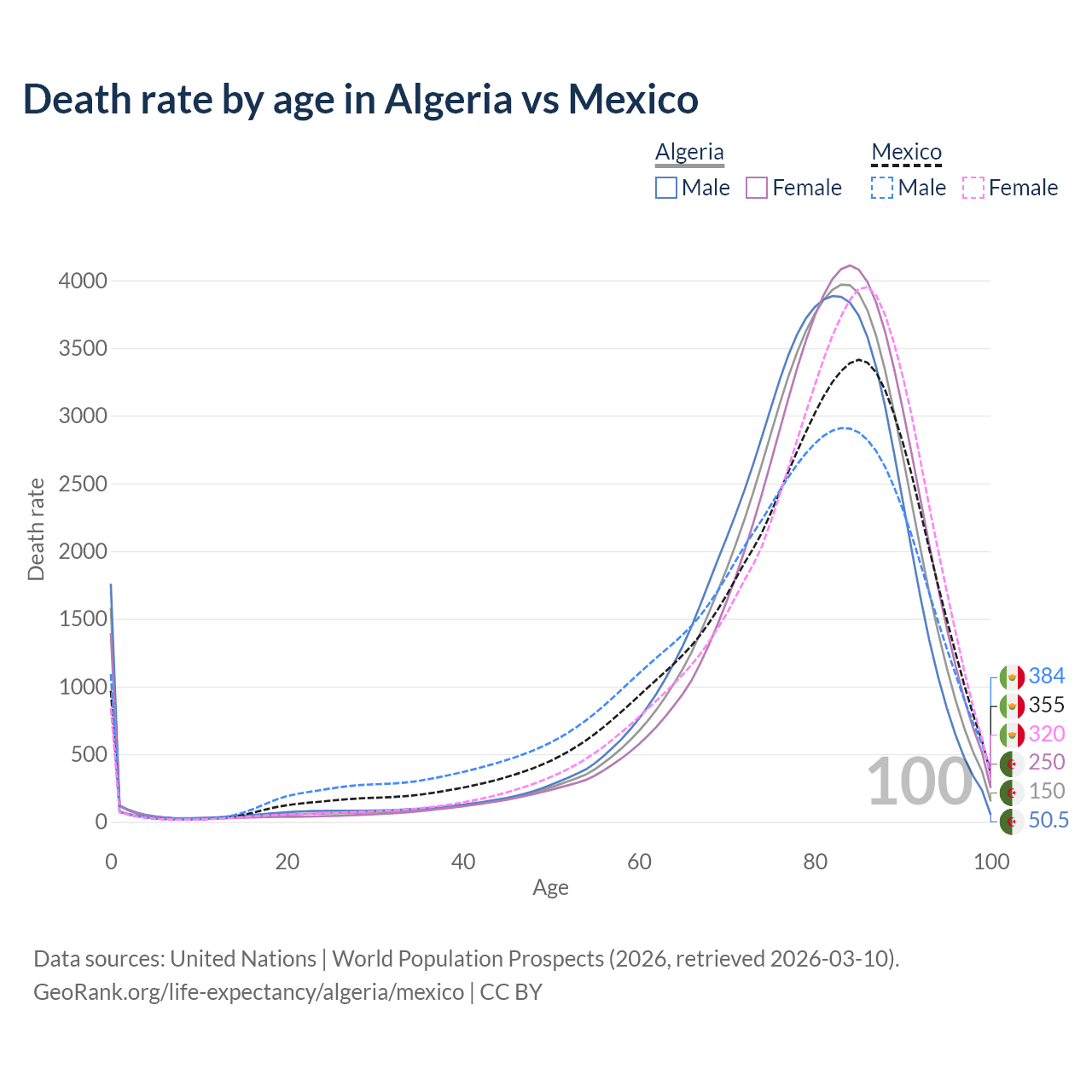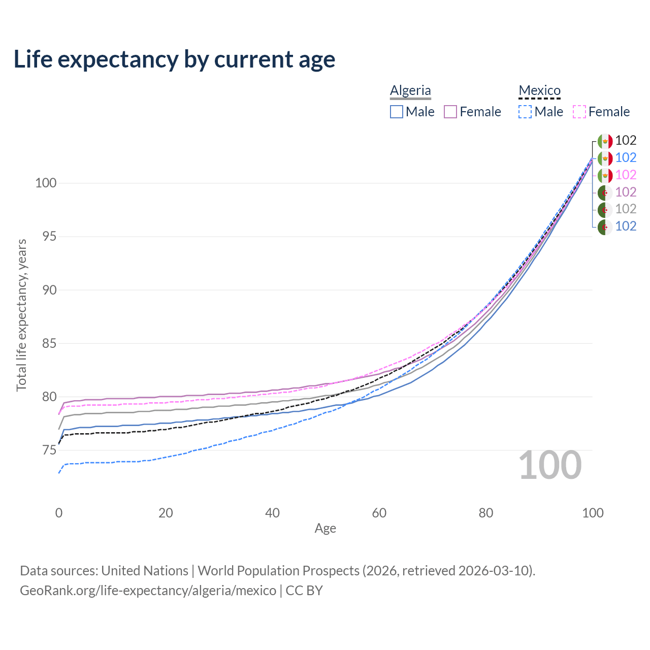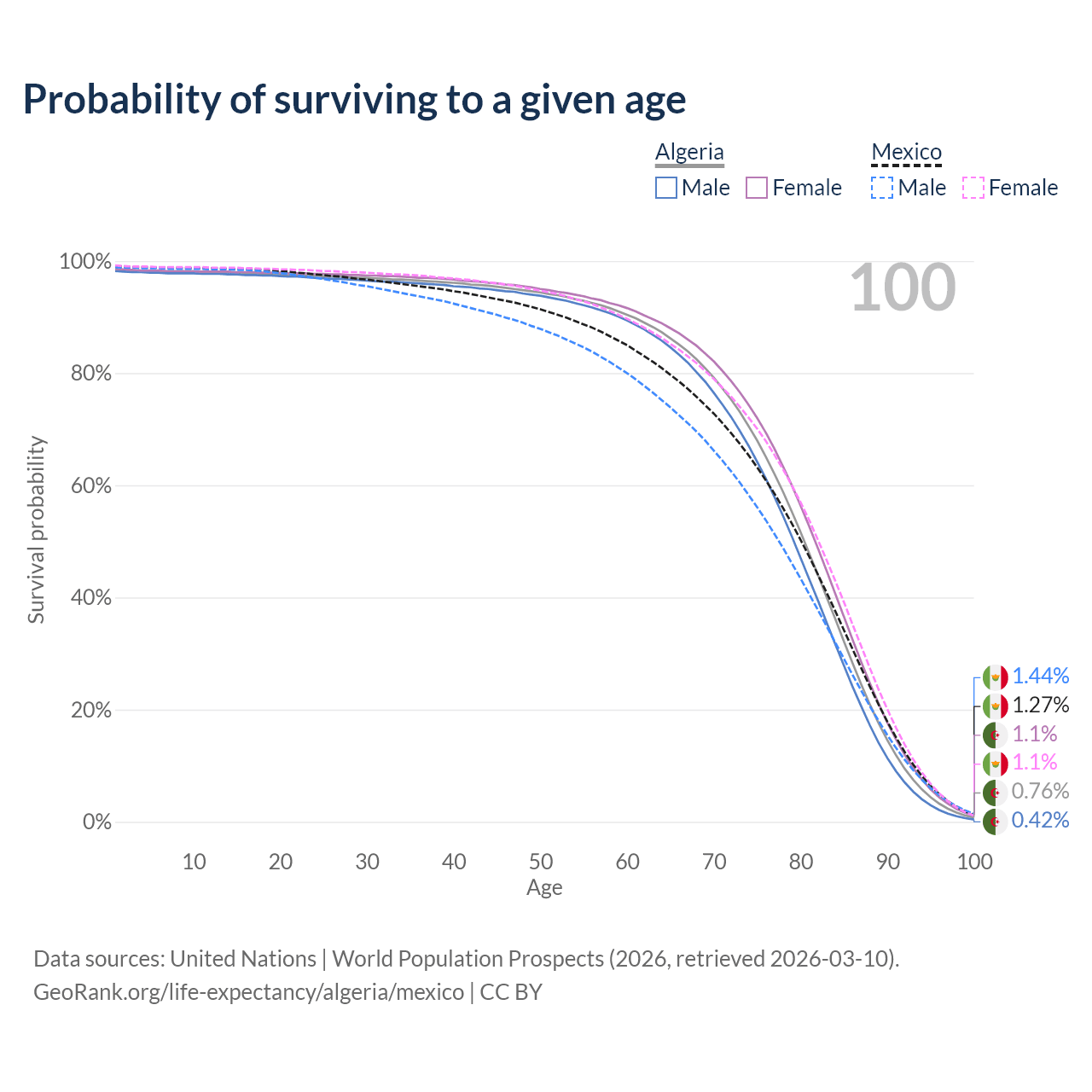 This life expectancy calculator shows the odds of living to 100, 95, 90, and below based on current age for both males and females in Algeria and Mexico, along with mean and median age of death. The calculations are based on the 2026 life tables (actuarial tables) from the UN World Population Prospects.