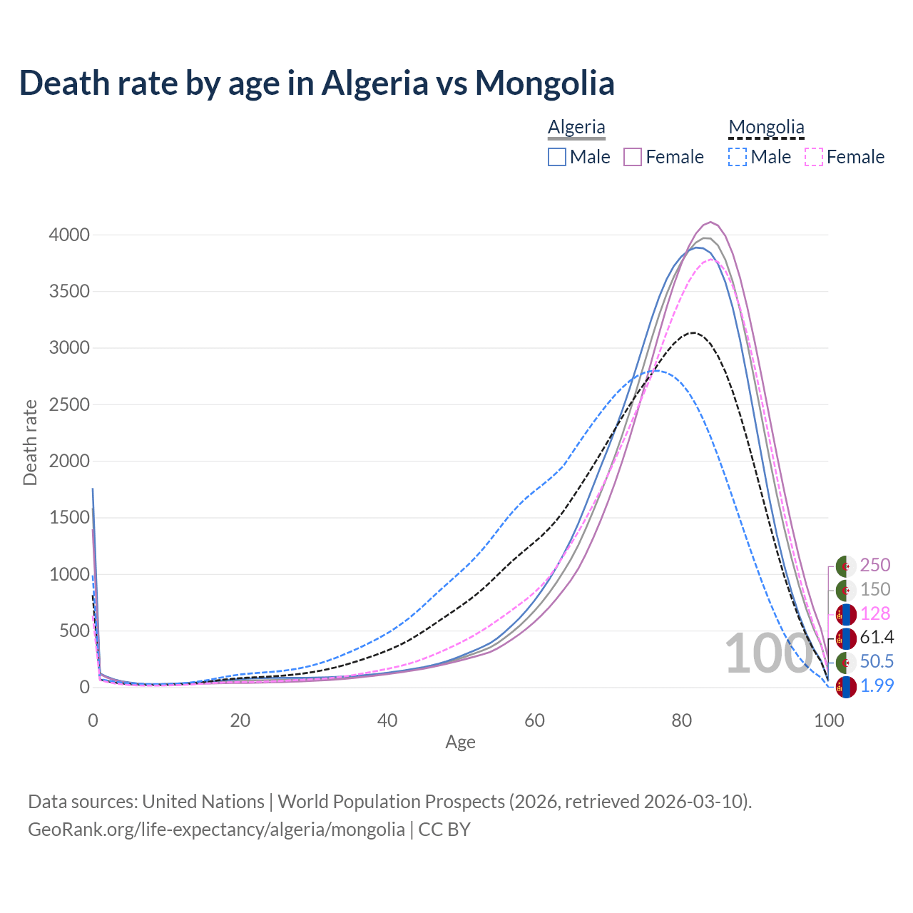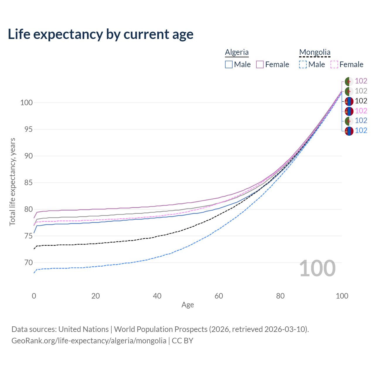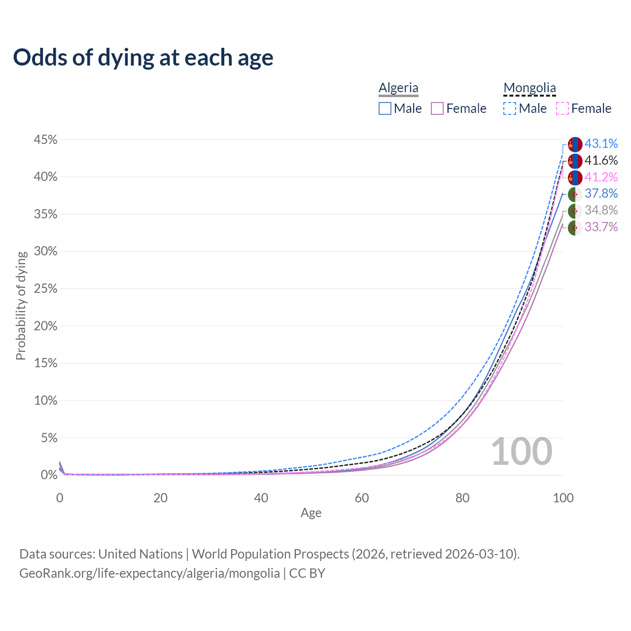 This life expectancy calculator shows the odds of living to 100, 95, 90, and below based on current age for both males and females in Algeria and Mongolia, along with mean and median age of death. The calculations are based on the 2026 life tables (actuarial tables) from the UN World Population Prospects.