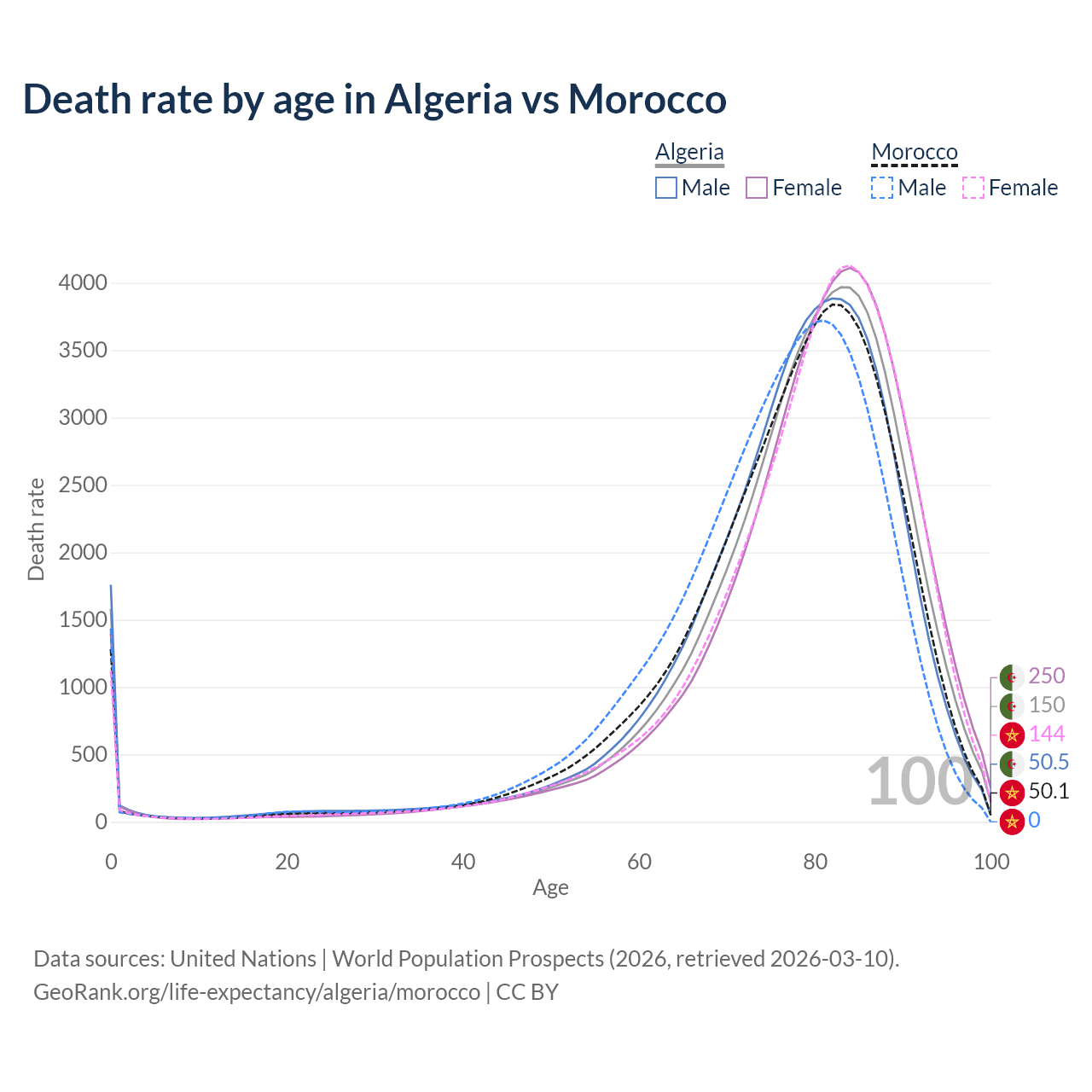 This life expectancy calculator shows the odds of living to 100, 95, 90, and below based on current age for both males and females in Algeria and Morocco, along with mean and median age of death. The calculations are based on the 2026 life tables (actuarial tables) from the UN World Population Prospects.
