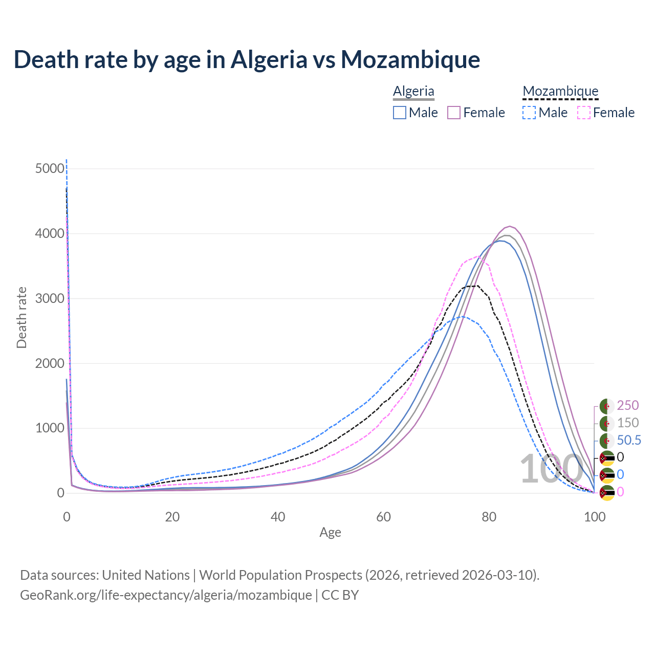 In Algeria, the most common age of death is 83, compared to 0 in Mozambique. The median age of death is 80.4 in Algeria and 71.2 in Mozambique, meaning only half of each cohort is expected to live past that age.