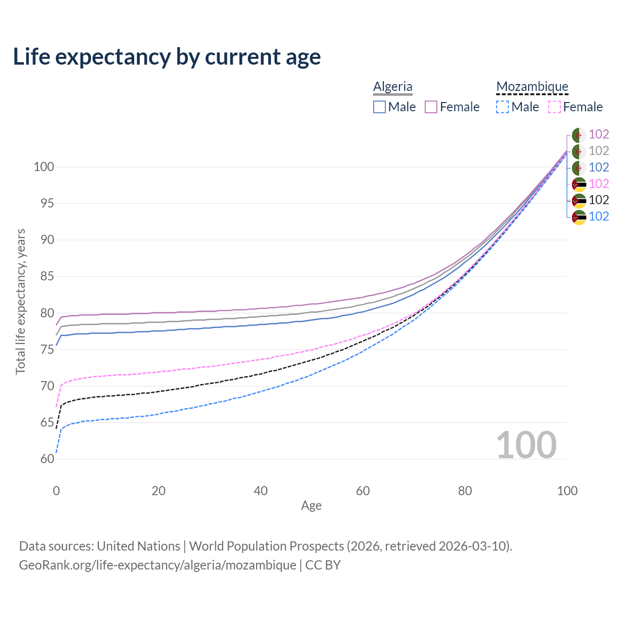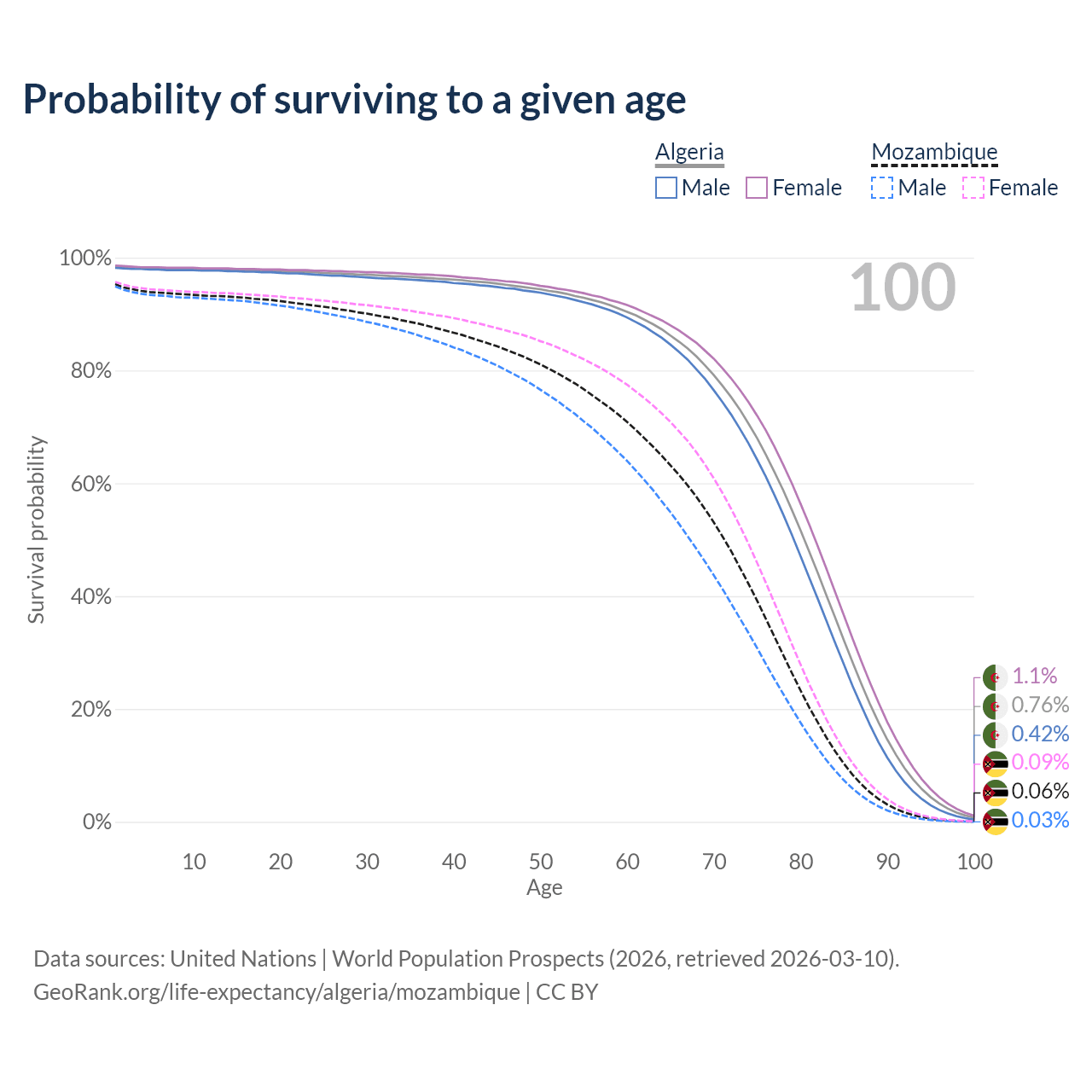 This life expectancy calculator shows the odds of living to 100, 95, 90, and below based on current age for both males and females in Algeria and Mozambique, along with mean and median age of death. The calculations are based on the 2026 life tables (actuarial tables) from the UN World Population Prospects.