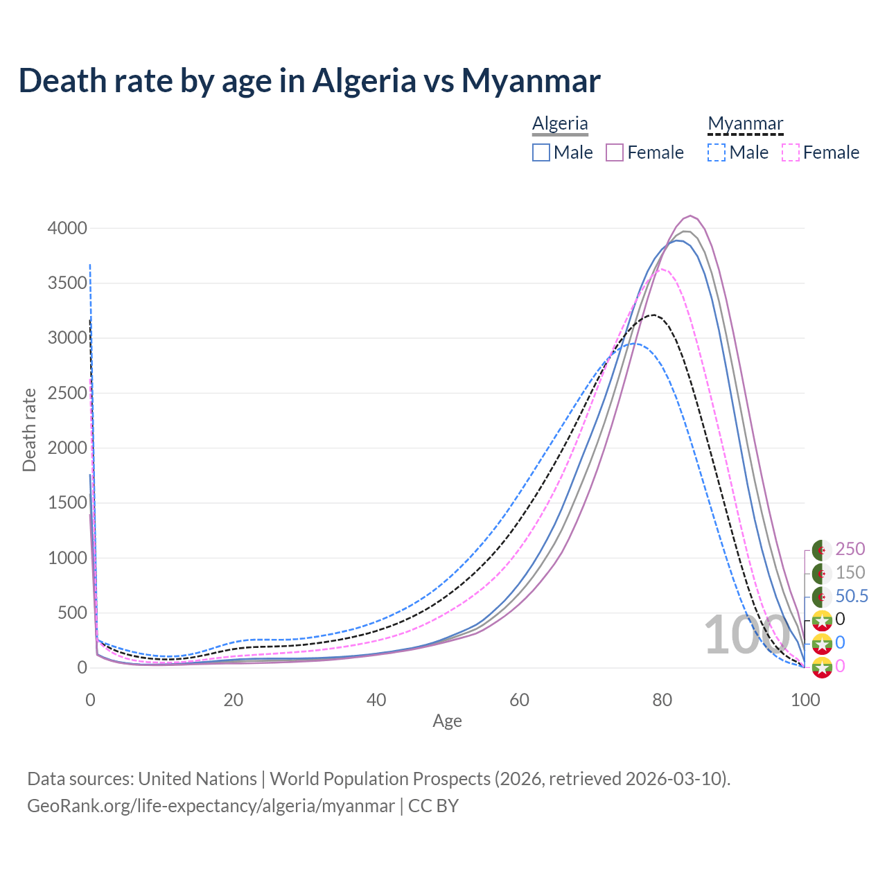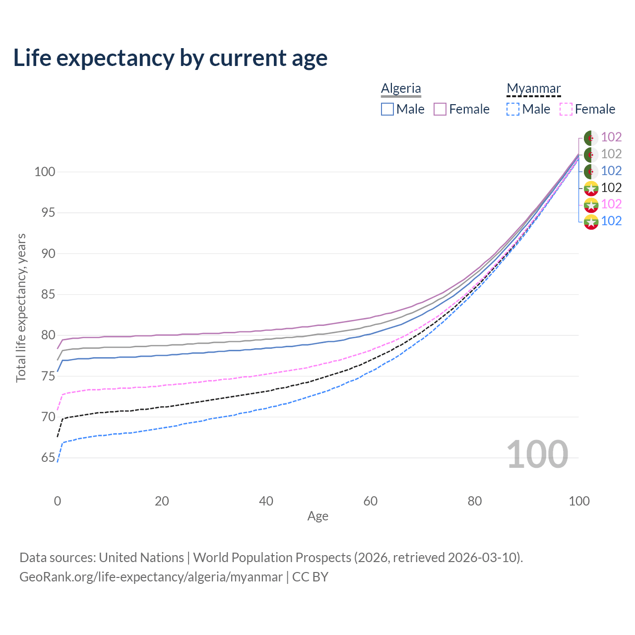 This life expectancy calculator shows the odds of living to 100, 95, 90, and below based on current age for both males and females in Algeria and Myanmar, along with mean and median age of death. The calculations are based on the 2026 life tables (actuarial tables) from the UN World Population Prospects.