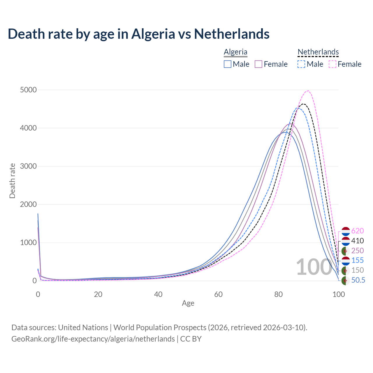 In Algeria, the most common age of death is 83, compared to 88 in the Netherlands. The median age of death is 80.4 in Algeria and 85.5 in the Netherlands, meaning only half of each cohort is expected to live past that age.