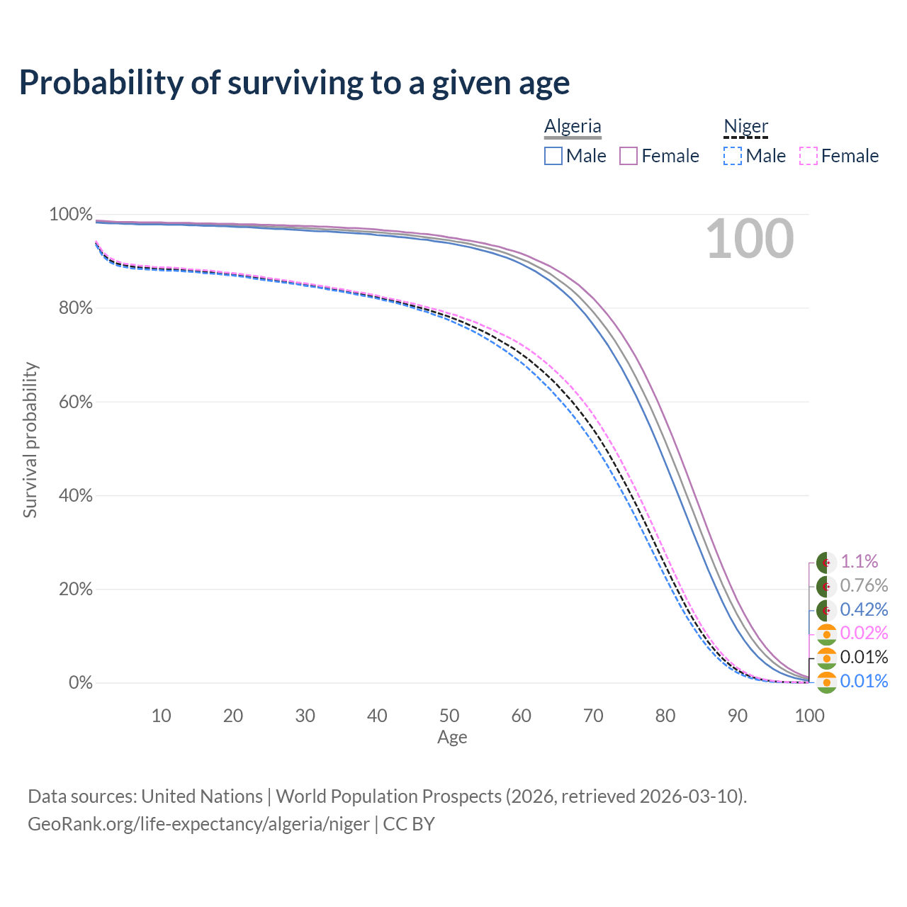 This life expectancy calculator shows the odds of living to 100, 95, 90, and below based on current age for both males and females in Algeria and Niger, along with mean and median age of death. The calculations are based on the 2026 life tables (actuarial tables) from the UN World Population Prospects.