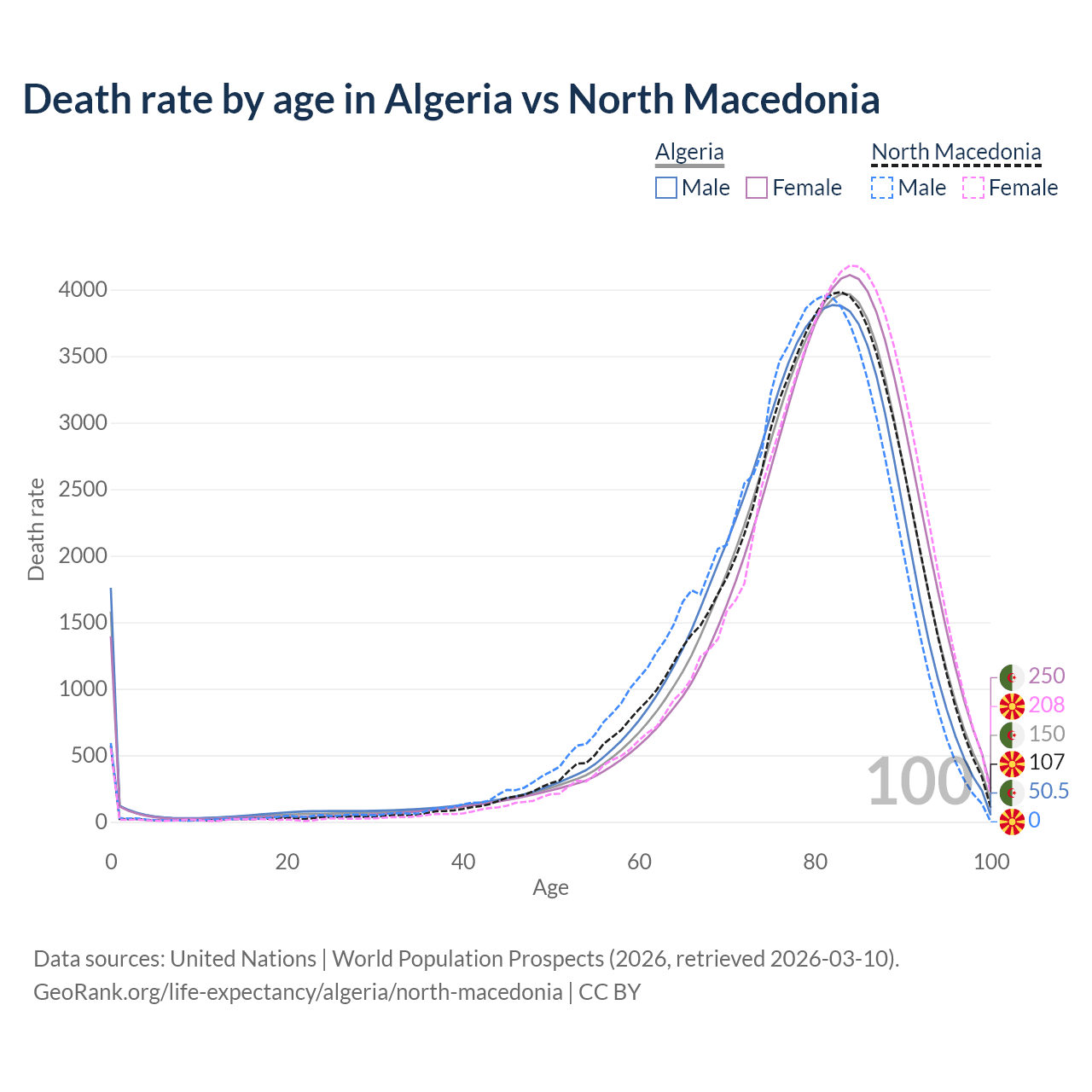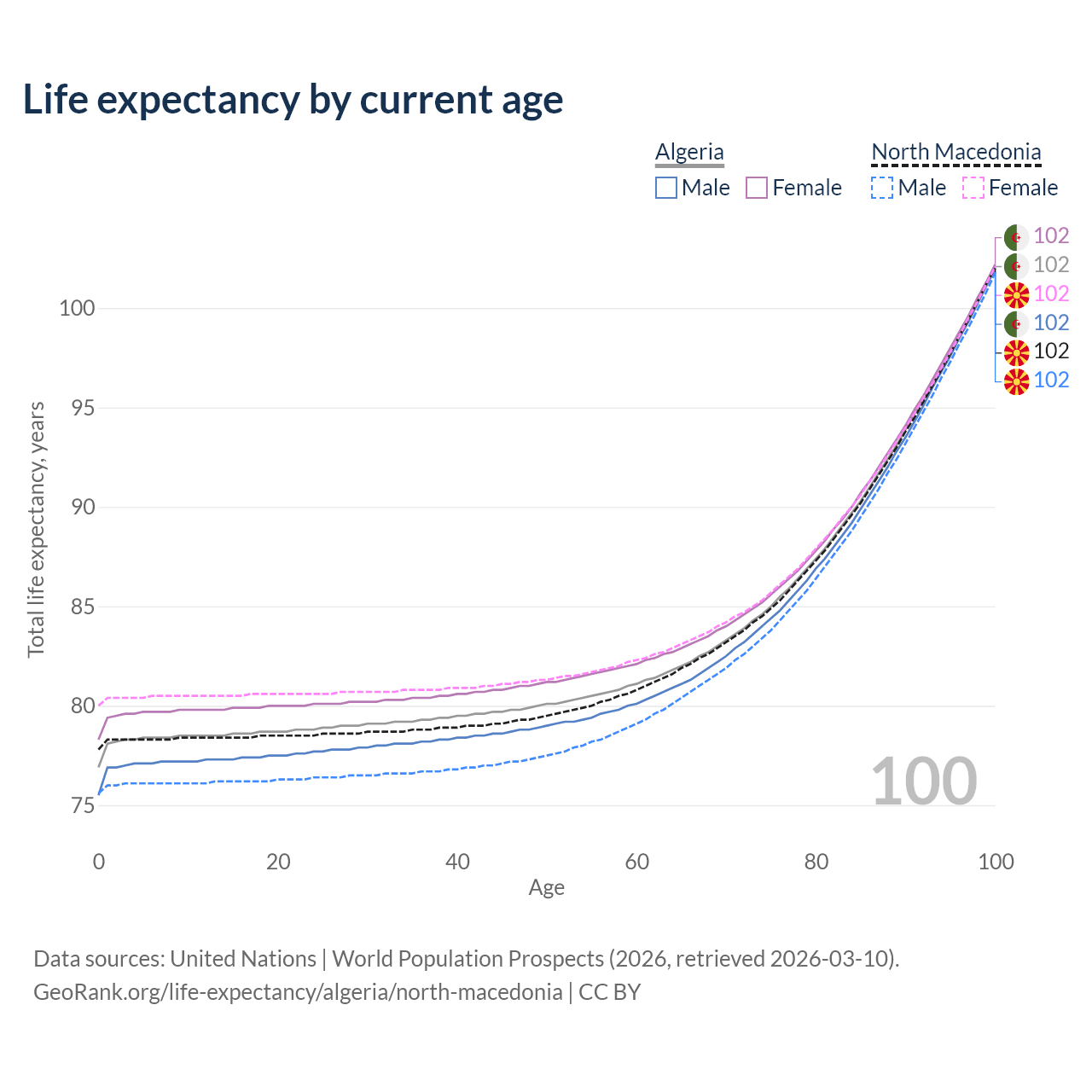 This life expectancy calculator shows the odds of living to 100, 95, 90, and below based on current age for both males and females in Algeria and North Macedonia, along with mean and median age of death. The calculations are based on the 2026 life tables (actuarial tables) from the UN World Population Prospects.