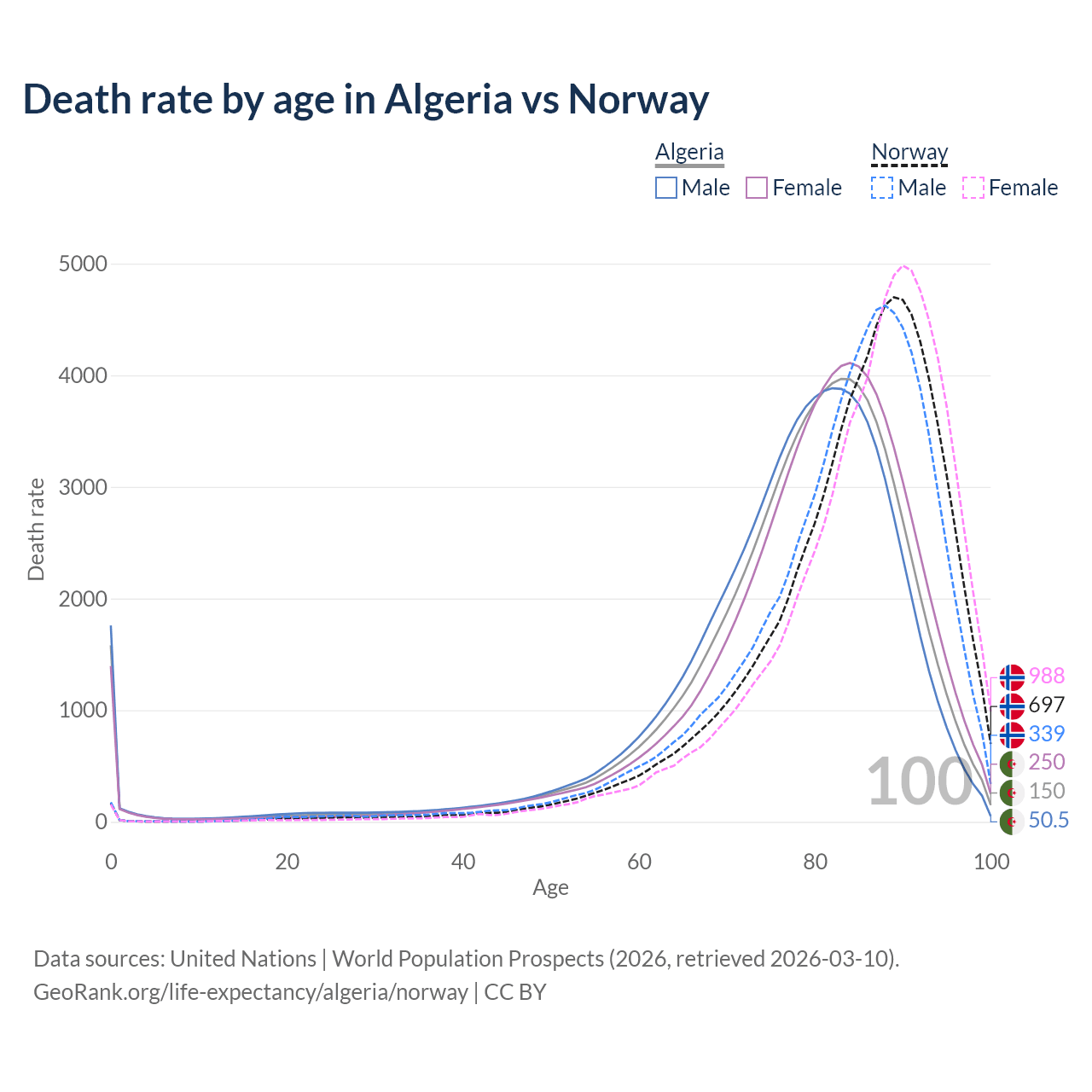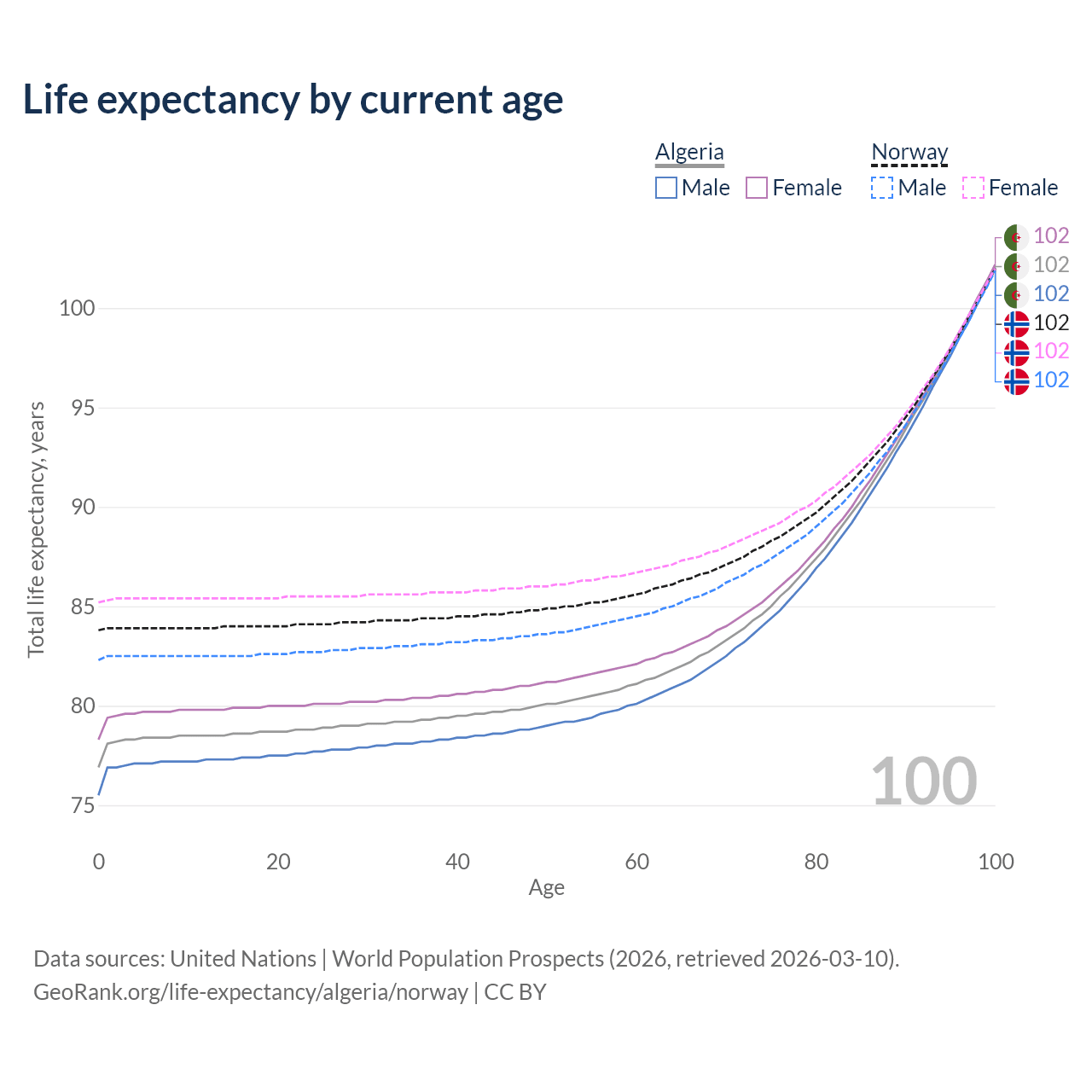 This life expectancy calculator shows the odds of living to 100, 95, 90, and below based on current age for both males and females in Algeria and Norway, along with mean and median age of death. The calculations are based on the 2026 life tables (actuarial tables) from the UN World Population Prospects.