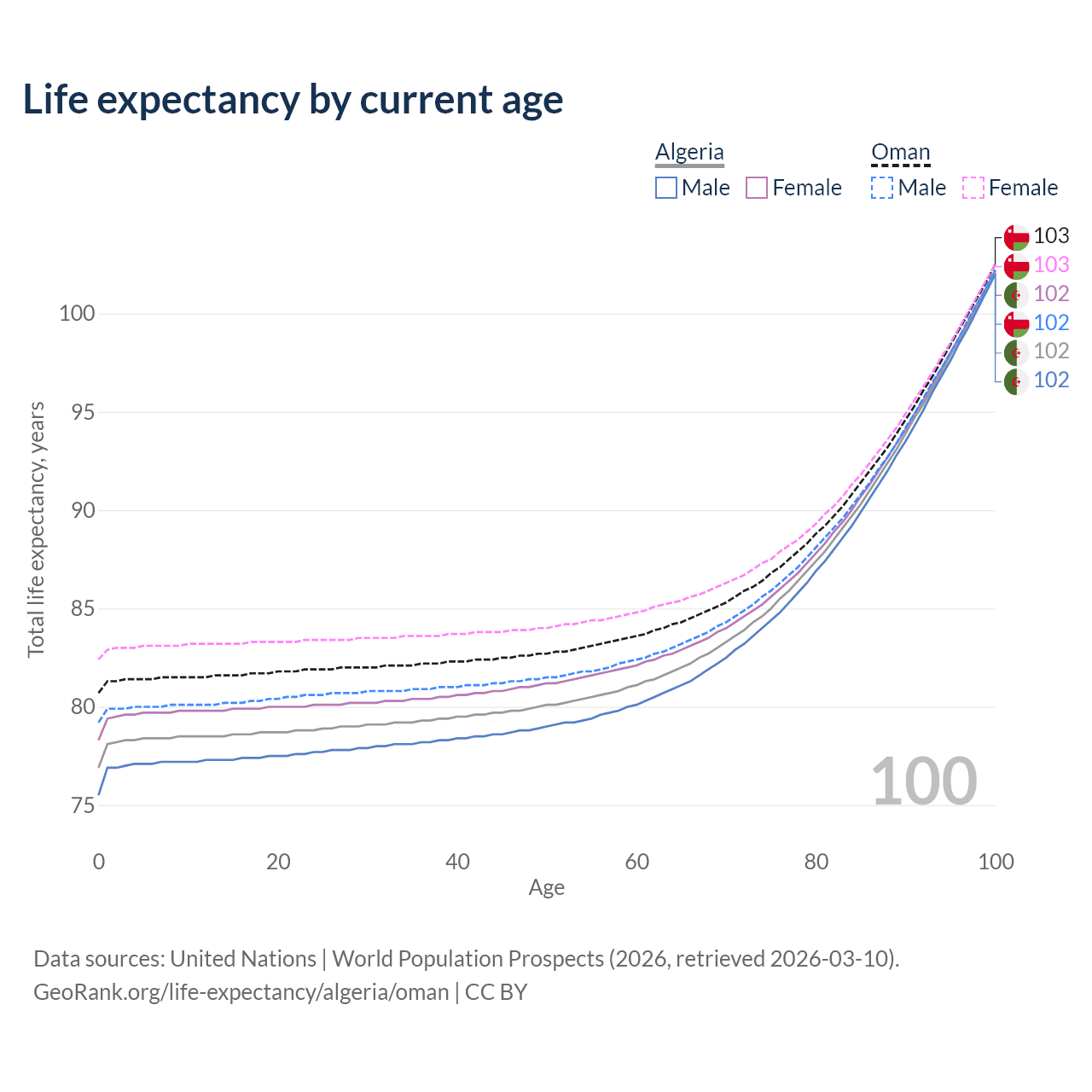 This life expectancy calculator shows the odds of living to 100, 95, 90, and below based on current age for both males and females in Algeria and Oman, along with mean and median age of death. The calculations are based on the 2026 life tables (actuarial tables) from the UN World Population Prospects.