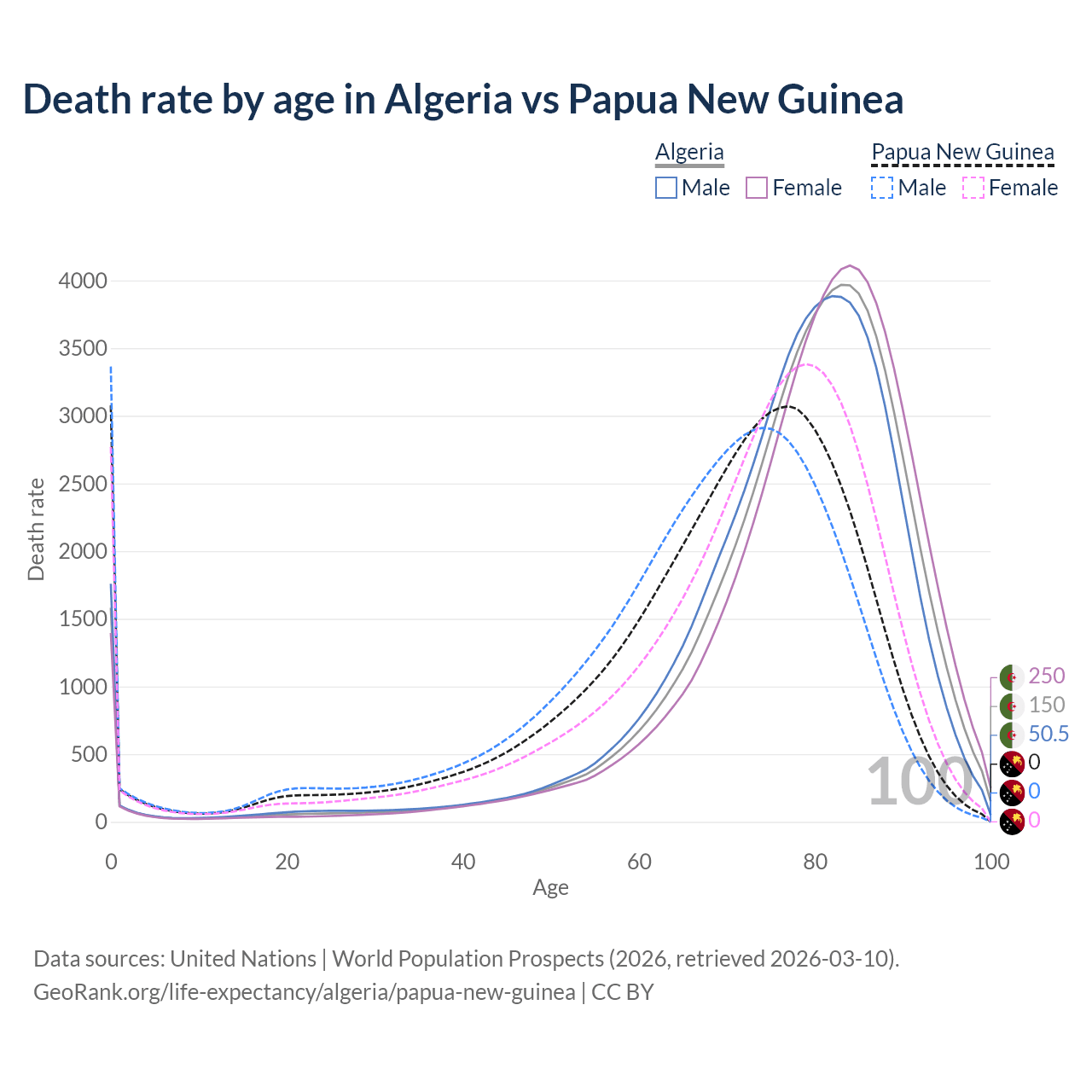 In Algeria, the most common age of death is 83, compared to 0 in Papua New Guinea. The median age of death is 80.4 in Algeria and 71.7 in Papua New Guinea, meaning only half of each cohort is expected to live past that age.