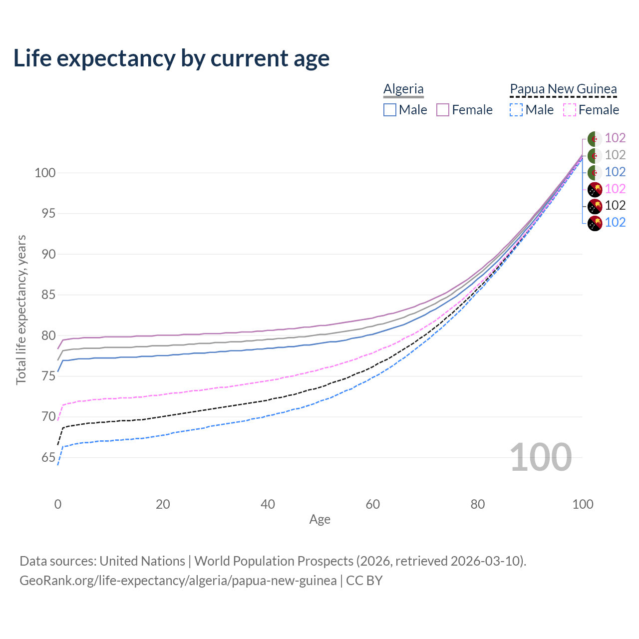 The average life expectancy at birth is 76.9 years in Algeria vs 66.5 in Papua New Guinea. Algeria is ranked 76/197 by life expectancy, and Papua New Guinea is 166/197. In Algeria, the life expectancy is 75.5 years for males and 78.3 years for females. In Papua New Guinea, it's 64 years for males and 69.5 years for females.