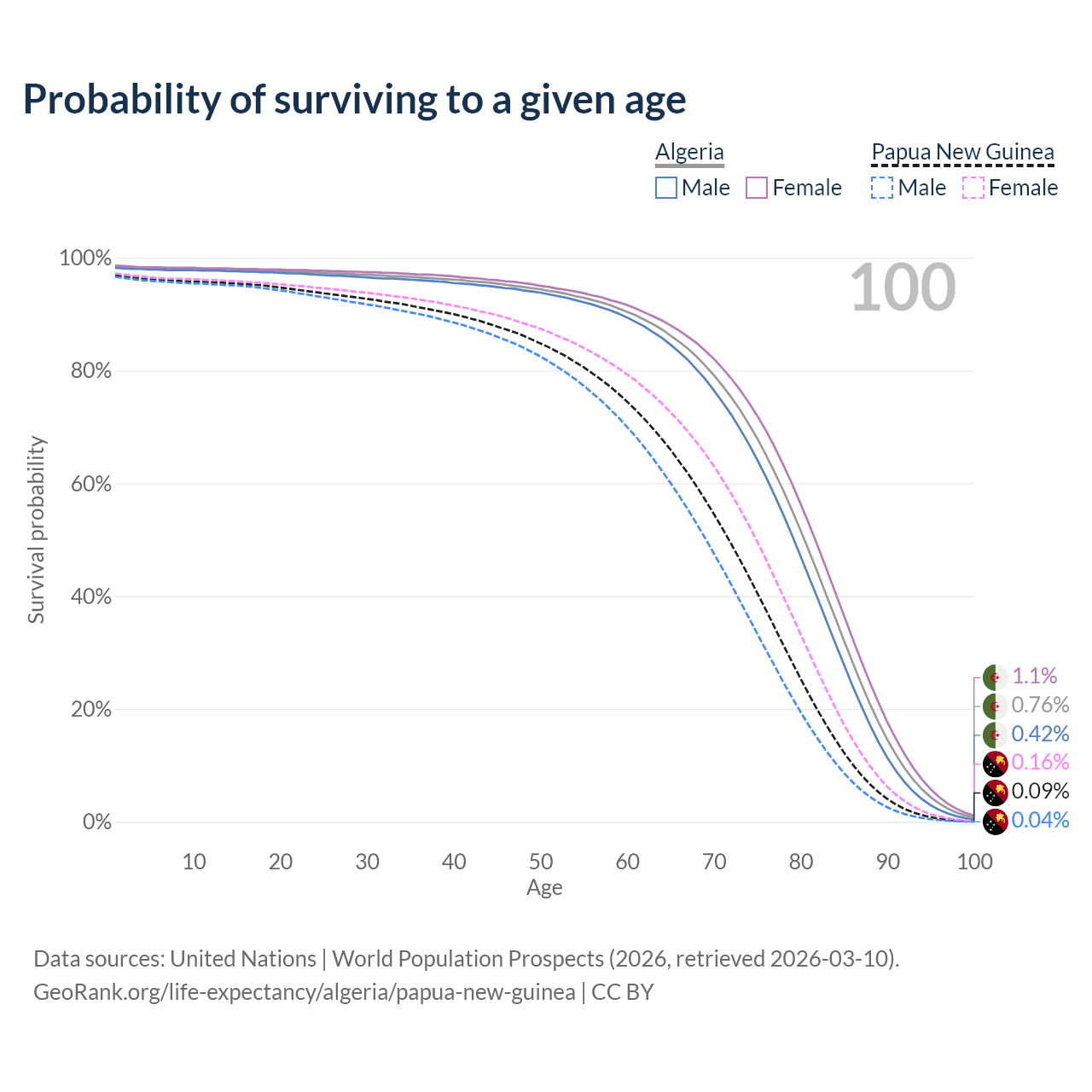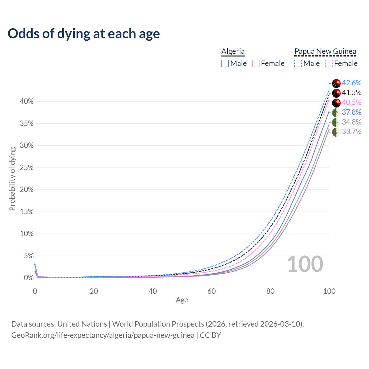 This life expectancy calculator shows the odds of living to 100, 95, 90, and below based on current age for both males and females in Algeria and Papua New Guinea, along with mean and median age of death. The calculations are based on the 2026 life tables (actuarial tables) from the UN World Population Prospects.
