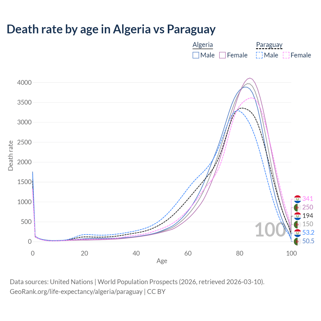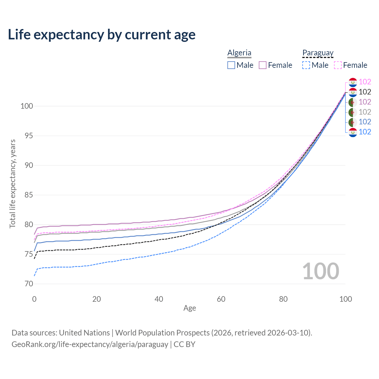 This life expectancy calculator shows the odds of living to 100, 95, 90, and below based on current age for both males and females in Algeria and Paraguay, along with mean and median age of death. The calculations are based on the 2026 life tables (actuarial tables) from the UN World Population Prospects.