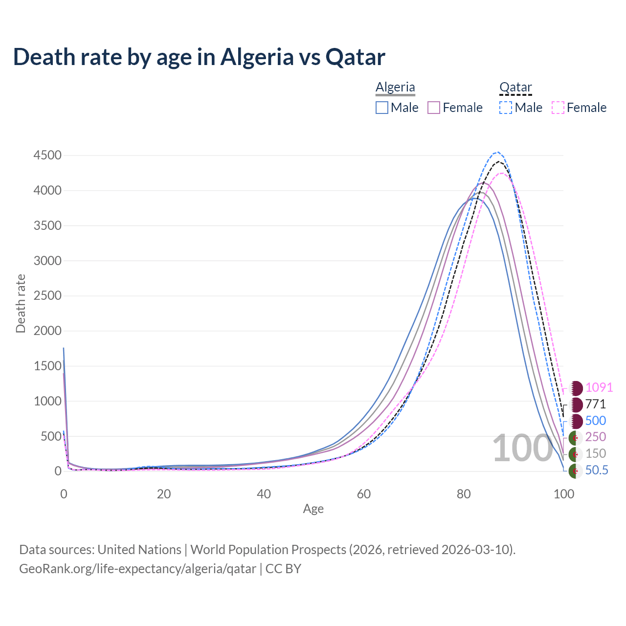 This life expectancy calculator shows the odds of living to 100, 95, 90, and below based on current age for both males and females in Algeria and Qatar, along with mean and median age of death. The calculations are based on the 2026 life tables (actuarial tables) from the UN World Population Prospects.