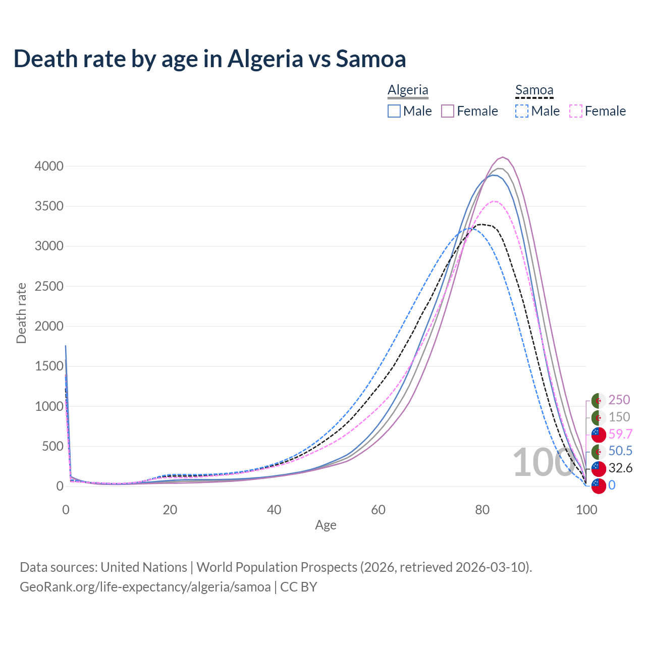 In Algeria, the most common age of death is 83, compared to 80 in Samoa. The median age of death is 80.4 in Algeria and 75.9 in Samoa, meaning only half of each cohort is expected to live past that age.
