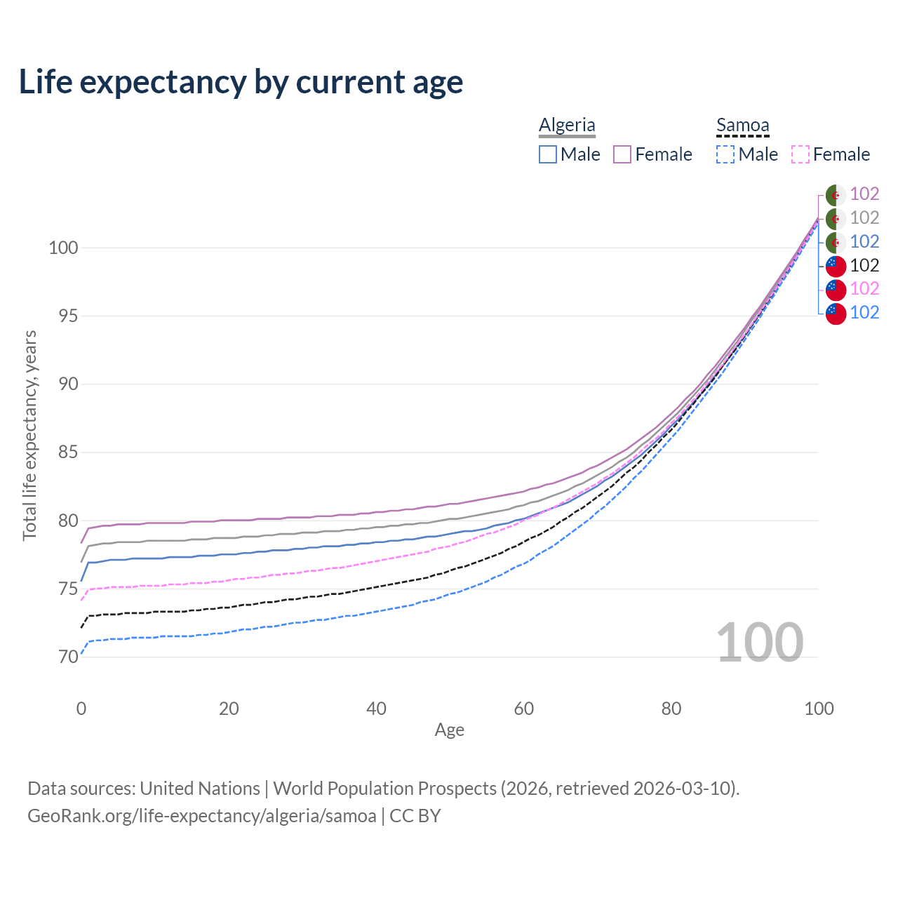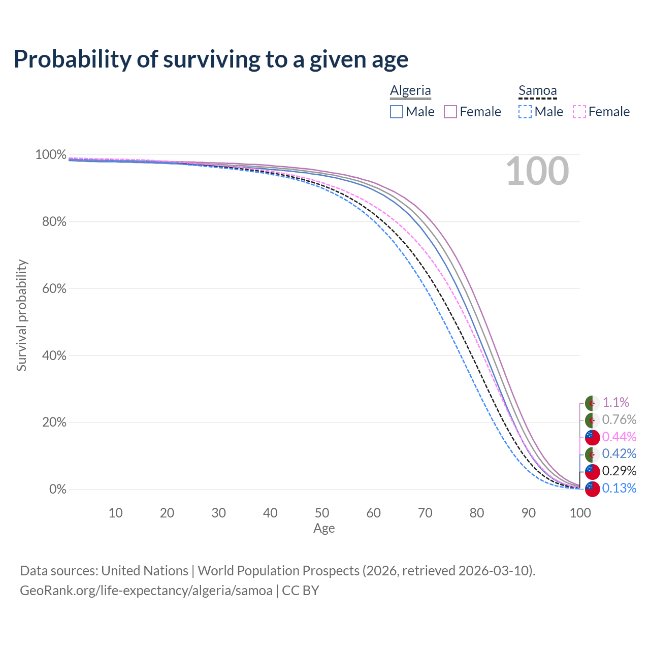 This life expectancy calculator shows the odds of living to 100, 95, 90, and below based on current age for both males and females in Algeria and Samoa, along with mean and median age of death. The calculations are based on the 2026 life tables (actuarial tables) from the UN World Population Prospects.