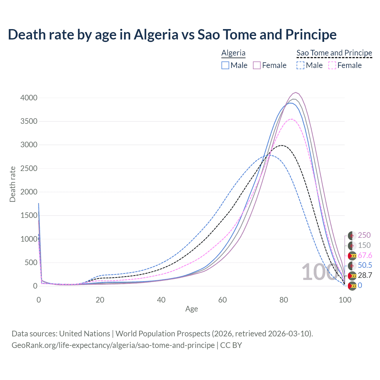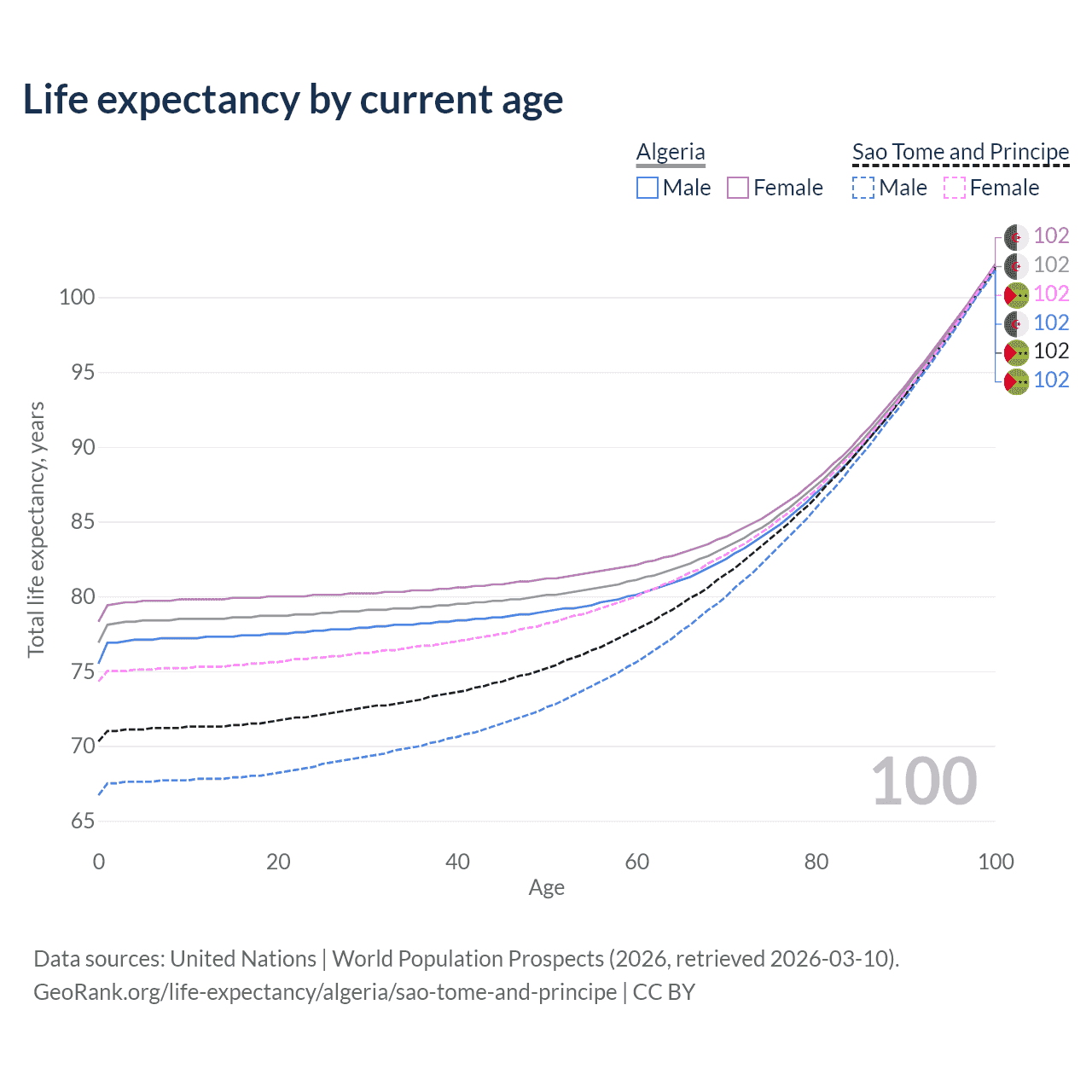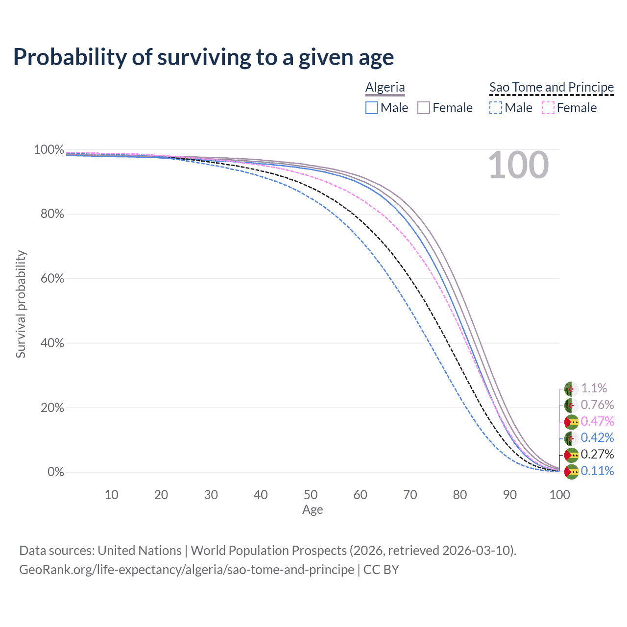 This life expectancy calculator shows the odds of living to 100, 95, 90, and below based on current age for both males and females in Algeria and Sao Tome and Principe, along with mean and median age of death. The calculations are based on the 2026 life tables (actuarial tables) from the UN World Population Prospects.