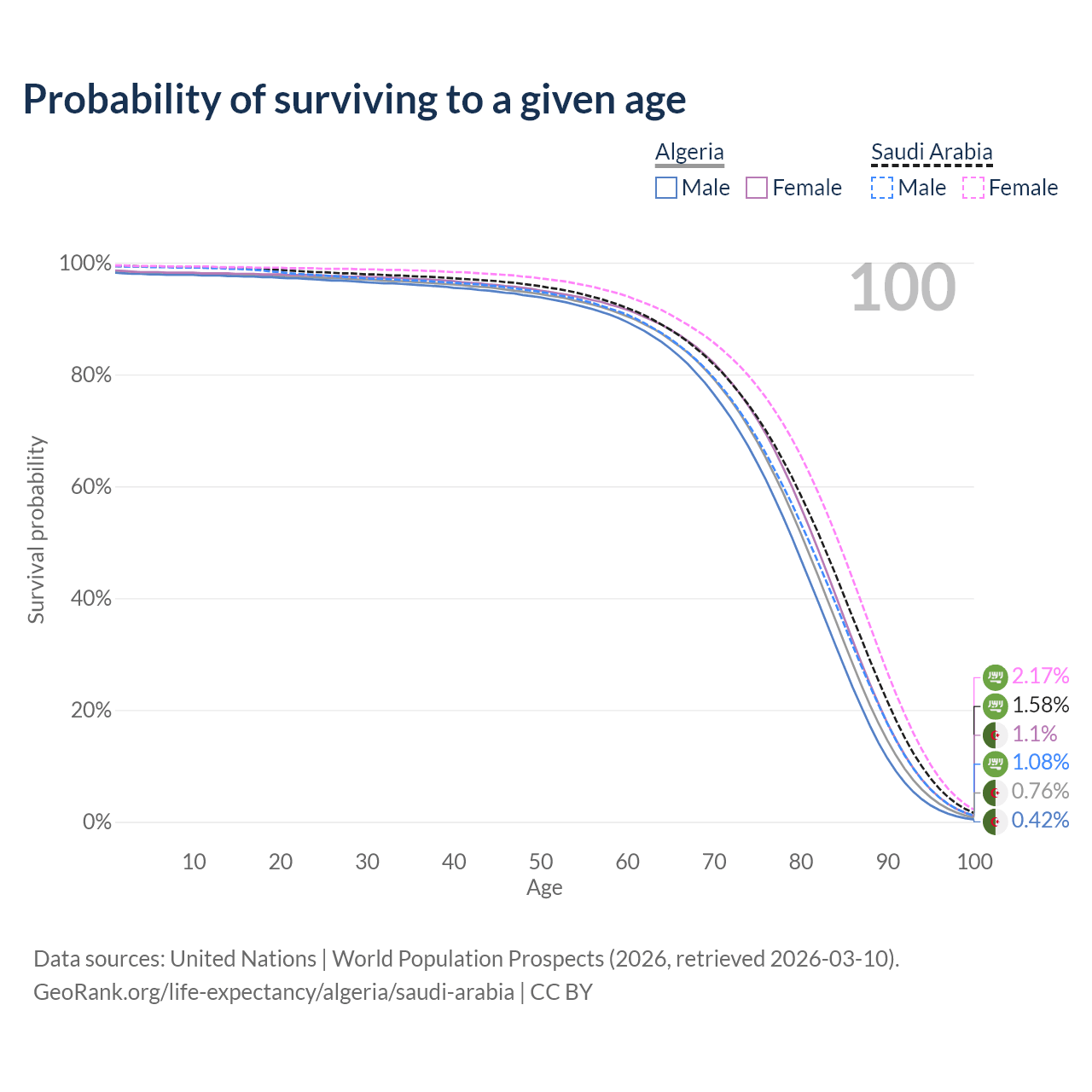 This life expectancy calculator shows the odds of living to 100, 95, 90, and below based on current age for both males and females in Algeria and Saudi Arabia, along with mean and median age of death. The calculations are based on the 2026 life tables (actuarial tables) from the UN World Population Prospects.