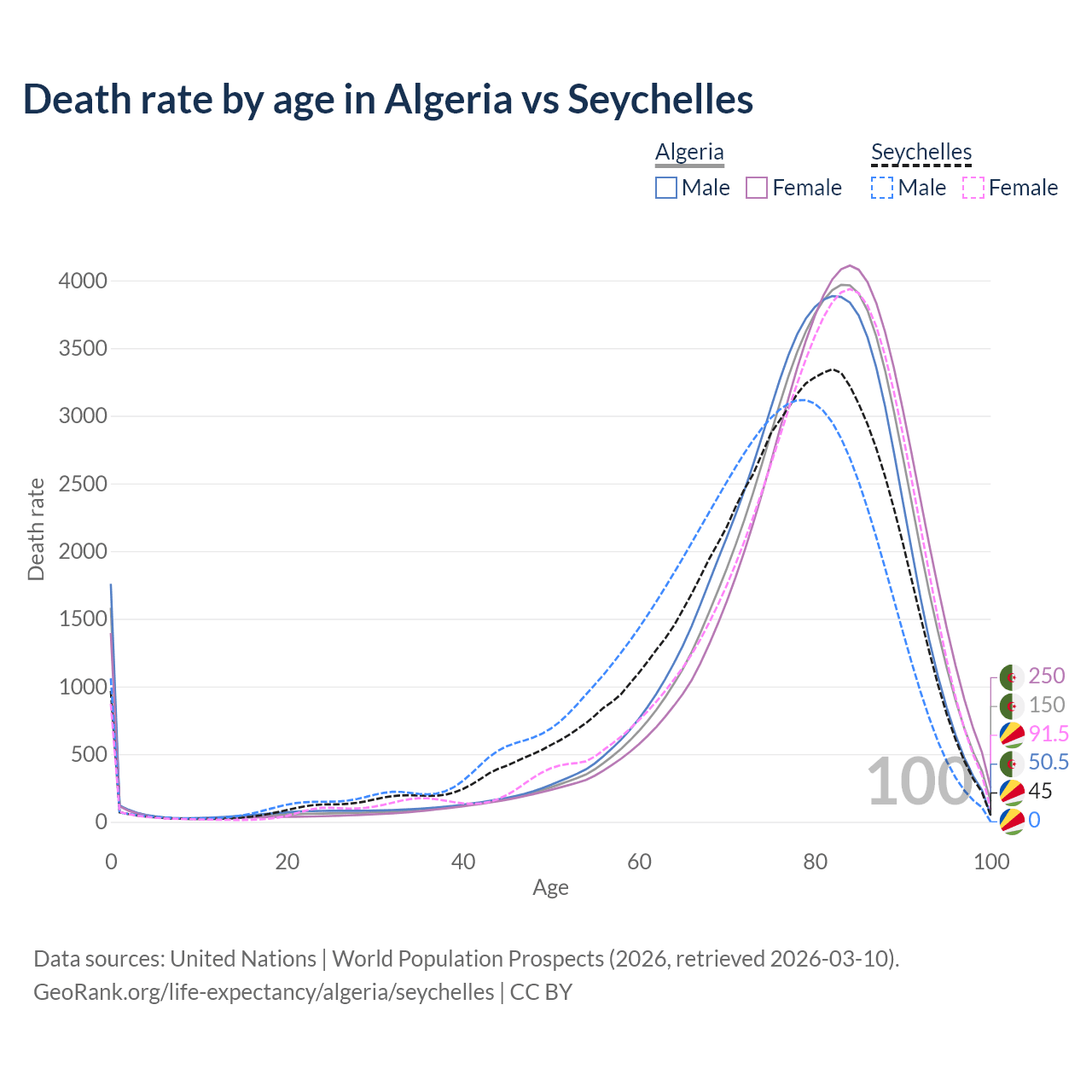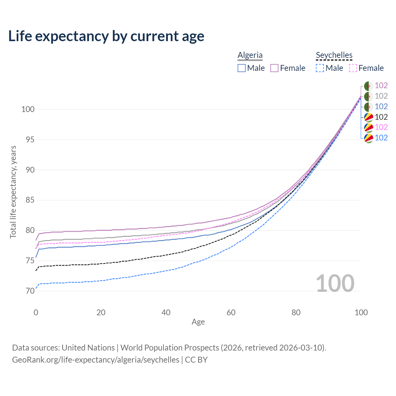 This life expectancy calculator shows the odds of living to 100, 95, 90, and below based on current age for both males and females in Algeria and the Seychelles, along with mean and median age of death. The calculations are based on the 2026 life tables (actuarial tables) from the UN World Population Prospects.